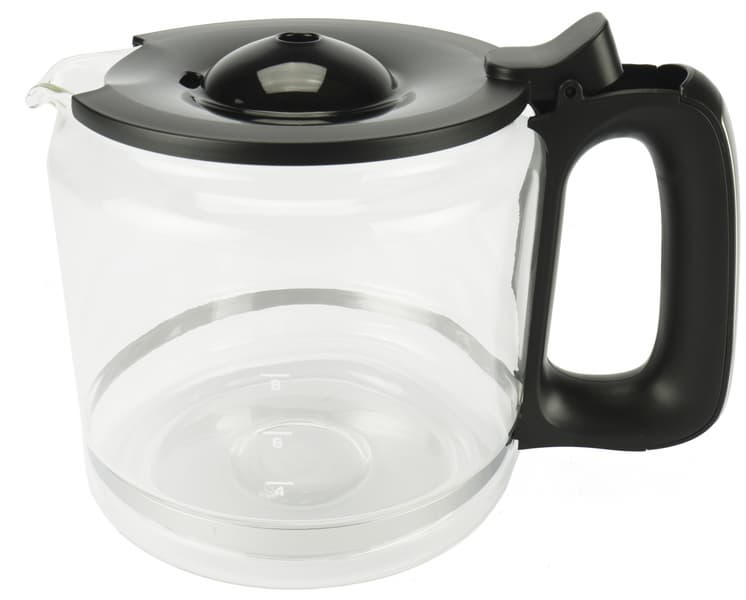 Кувшин у нашей кофеварки сделан из жаропрочного стекла, откидная крышка и ручка — пластиковые. На кувшине мы также видим градуировку в чашках (от 4 до 12).