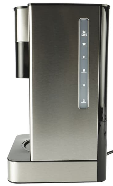 Открыв крышку, мы также получаем доступ к довольно вместительному резервуару объемом 1,8 л. Следить за его наполнением мы можем через окошко, расположенное на правой грани прибора. Тут мы найдем градуировку от 2 до 12 чашек. Несложно посчитать, что одна чашка таким образом соответствует 150 мл воды.