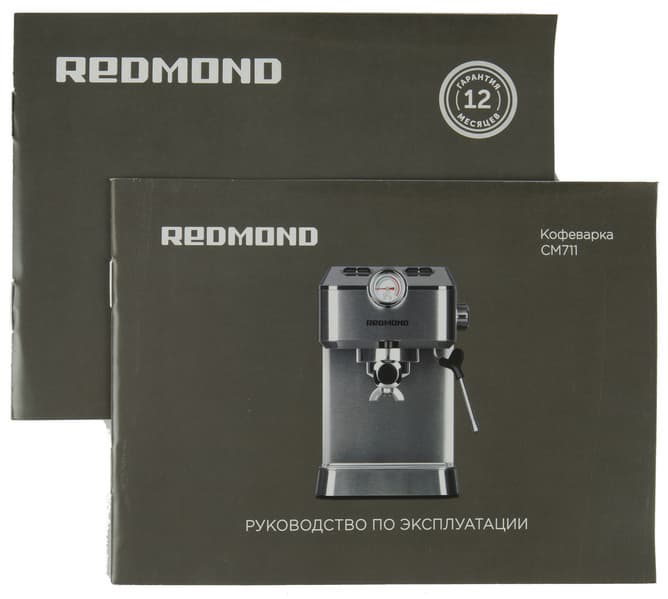 Кофеварка поставляется в коробке, оформленной в строгом стиле Redmond. Такую коробку можно увидеть, скорее, на полке с полу-профессиональными кофеварками, а не в отделе рожков для дома.
