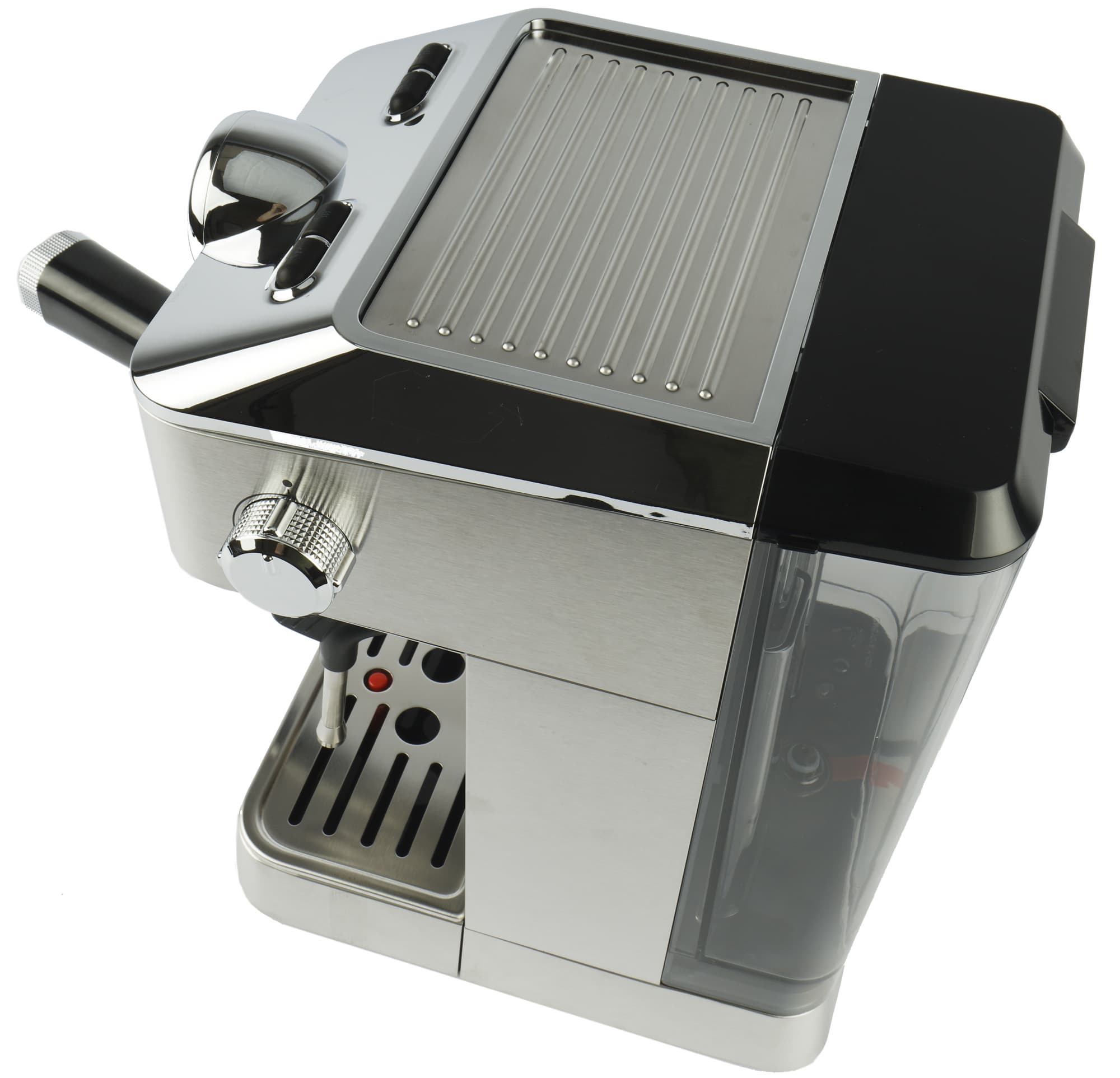 Контейнер для воды сделан из прозрачного затемненного пластика. Объем довольно большой — целых 1,5 литра, что предполагает активное использование и кофеварки, и капучинатора. Отметки Min и Max, соответствующие минимальному и максимальному уровню воды находится сзади, так что увидеть их получится лишь полностью сняв бак. Мы же, как водится, предпочитаем доливать воду сверху. Для этого у кофеварки предусмотрена откидная пластиковая крышка. В корпусе прибора контейнер фиксируется с легким щелчком. Специальной ручки или другого подобного механизма не предусмотрено.