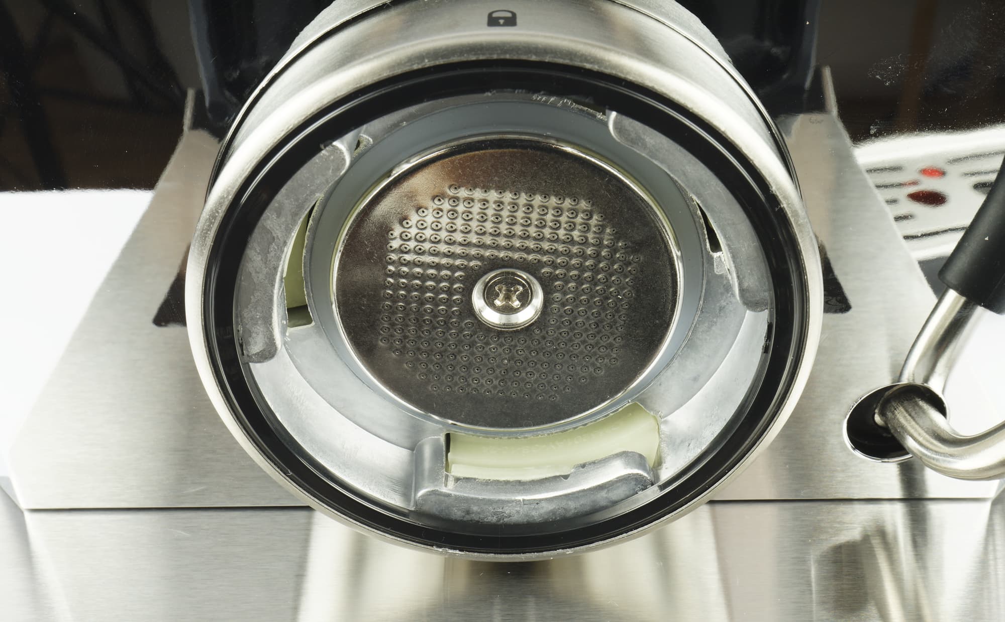 Сразу же обратим внимание и на заварочную группу. Она у нас почти полностью металлическая (хотя без небольшого количества пластика внутри не обошлось). Вода подается через стальное ситечко с большим количеством отверстий. Иконки с открытым и закрытым замком подскажут, как правильно установить рожок, и в каком положении его правильно зафиксировать.