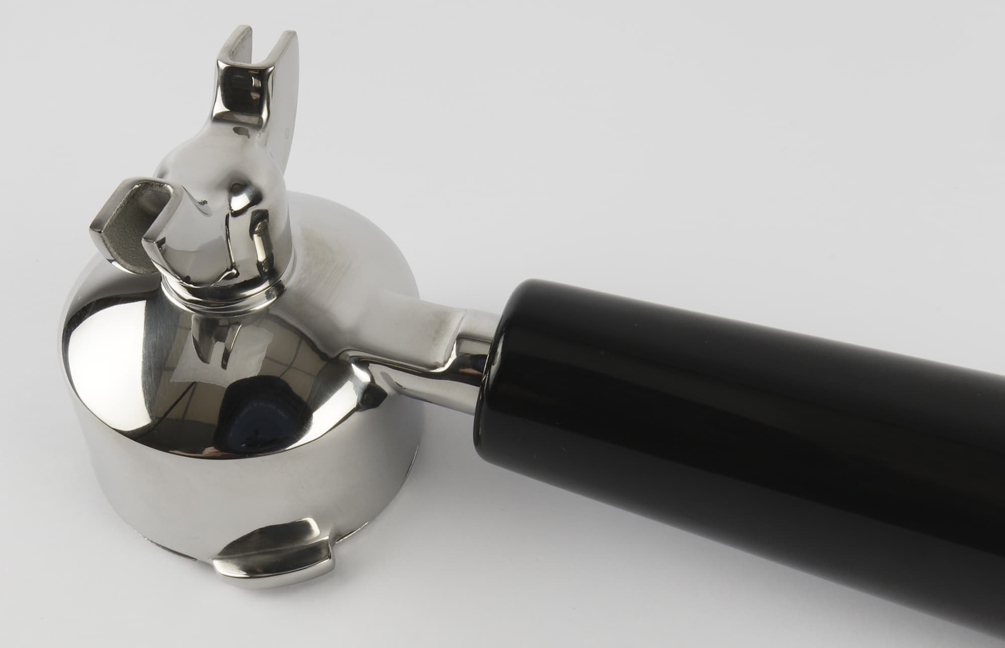Рожок диаметром 51-52 мм имеет пластиковую ручку. Основной материал рожка — легкий белый металл (силумин?). Ручка пластиковая, насадка на ручку также пластиковая, окрашенная под металл. Выглядит рожок неплохо, но далеко не элитно. Что, впрочем, является обычным делом для бюджетных кофеварок.