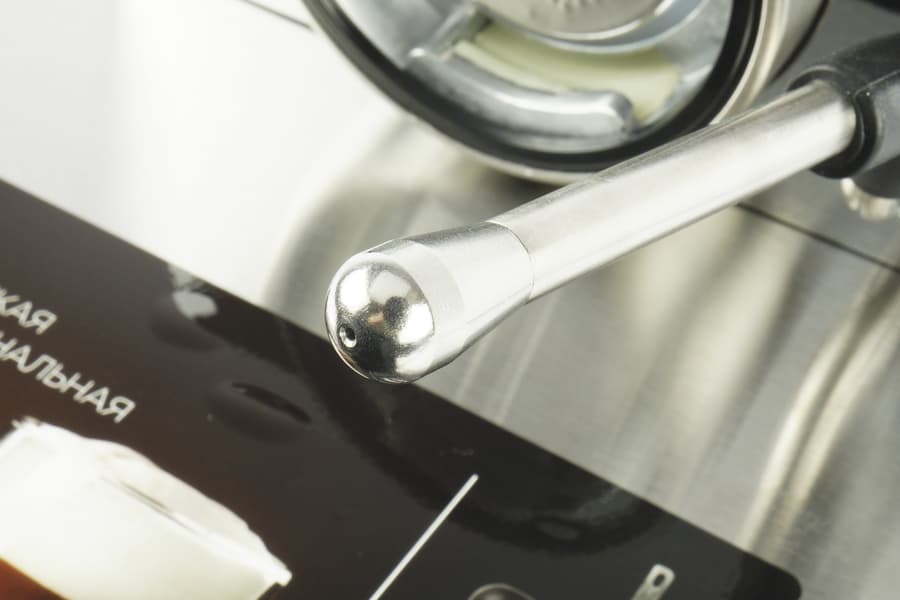 А вот ручка капучинатора пластиковая, окрашенная под металл. Выглядит бюджетно, однако именно такое решение мы обычно встречаем у домашних кофеварок.