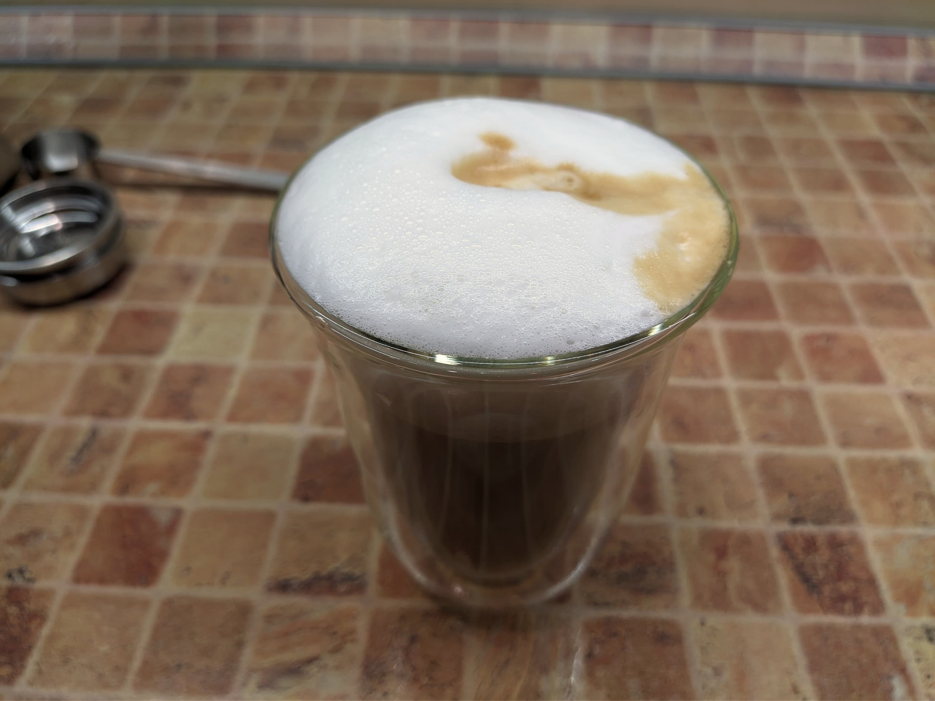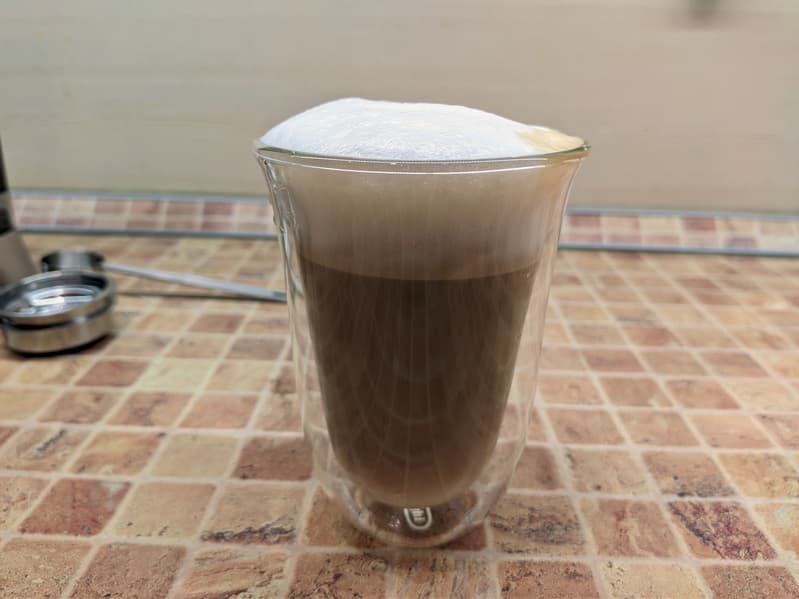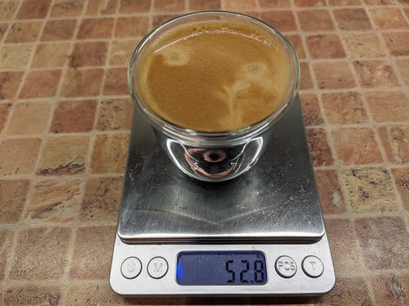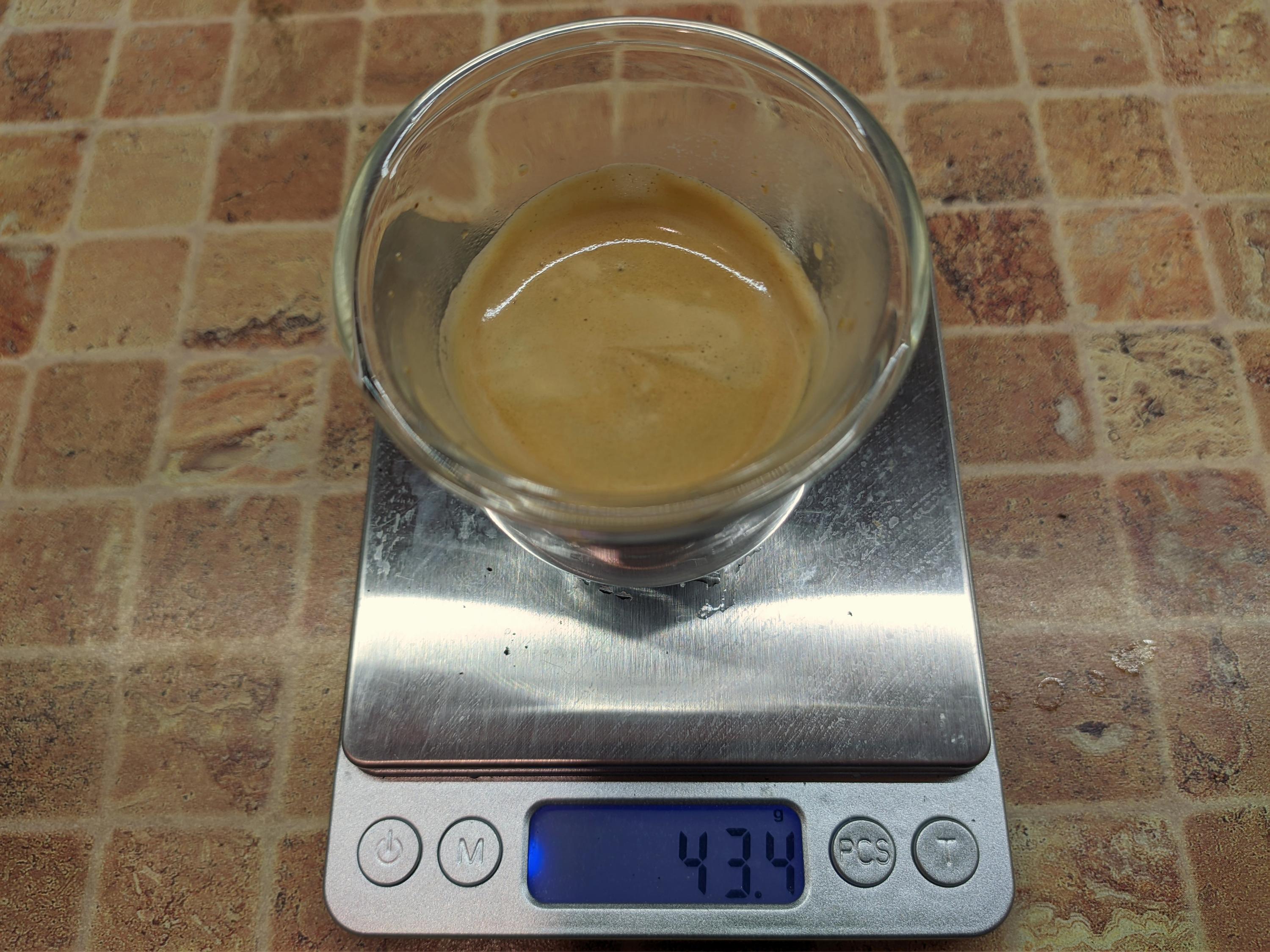 Двойной эспрессо готовится 25 секунд (плюс предсмачивание), вес готового напитка составил около 53 граммов, а температура готового напитка 74 °C (что гораздо лучше, чем при приготовлении одинарной порции).