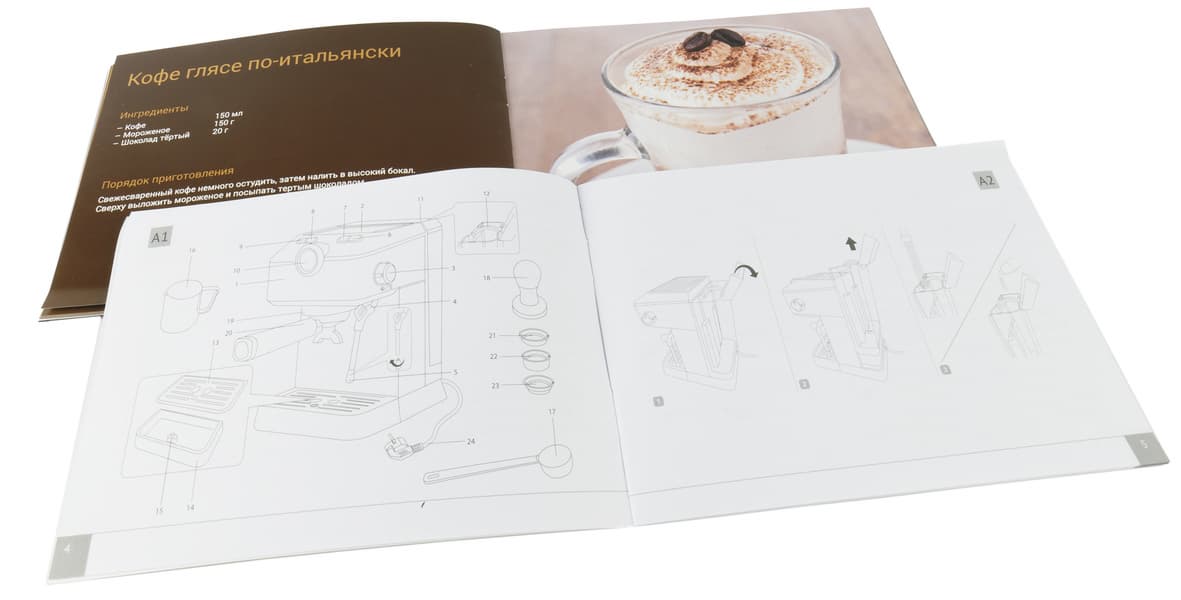 Дополнительно производитель положил в коробку полноцветную красочную брошюру с рецептами кофейных напитков. Выглядит она более чем достойно, и из нее можно почерпнуть некоторое количество полезной и интересной информации.