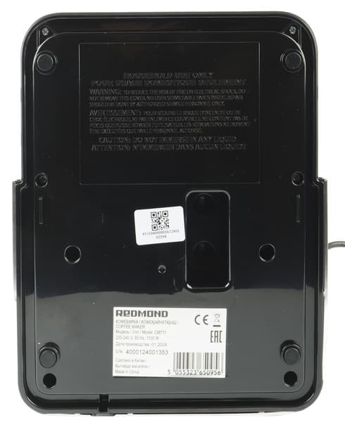 Снизу у кофеварки можно обнаружить резиновые ножки и наклейку с номером модели и технической информацией. Также снизу расположены вентиляционные отверстия, а вот отсека для хранения шнура не предусмотрено: не слишком длинный шнур просто просто выведен с тыльной стороны прибора.