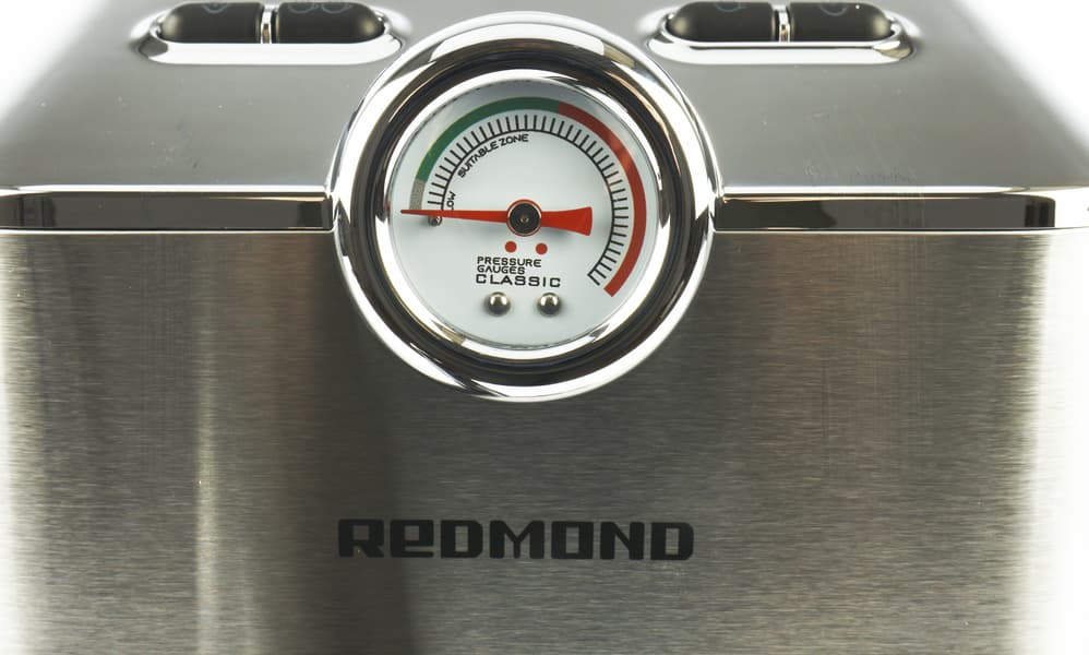 Манометр, расположенный рядом с кнопками, поможет контролировать давление при заваривании кофе. Числовых значений тут не предусмотрено, поэтому ориентироваться придется лишь примерно. Для удобства пользователя на шкале нанесена специальная «зеленая зона», в которой должна находиться стрелка в случае, если процесс приготовления напитка идет как надо.
