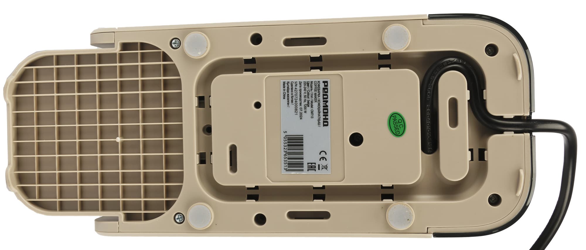 Снизу у кофеварки можно обнаружить резиновые ножки и наклейку с номером модели и технической информацией. Также снизу расположены вентиляционные отверстия и отсек для хранения шнура.