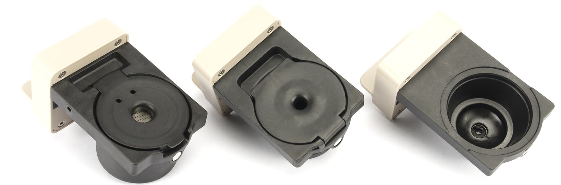 Адаптеры для различных типов кофе выполнены в едином форм-факторе, однако изнутри выглядят по-разному. Адаптер для Dolce Gusto (крайний справа) похож на простой пластиковый держатель, адаптер для молотого кофе (крайний слева) оснащен крышечкой и металлическим фильтром с двойным дном («улучшайзером») — точно таким же, какой можно встретить у многих бюджетных рожковых кофеварок. Адаптер для капсул Nespresso (посередине) имеет специальную крышечку с выступами для перфорации фольги.