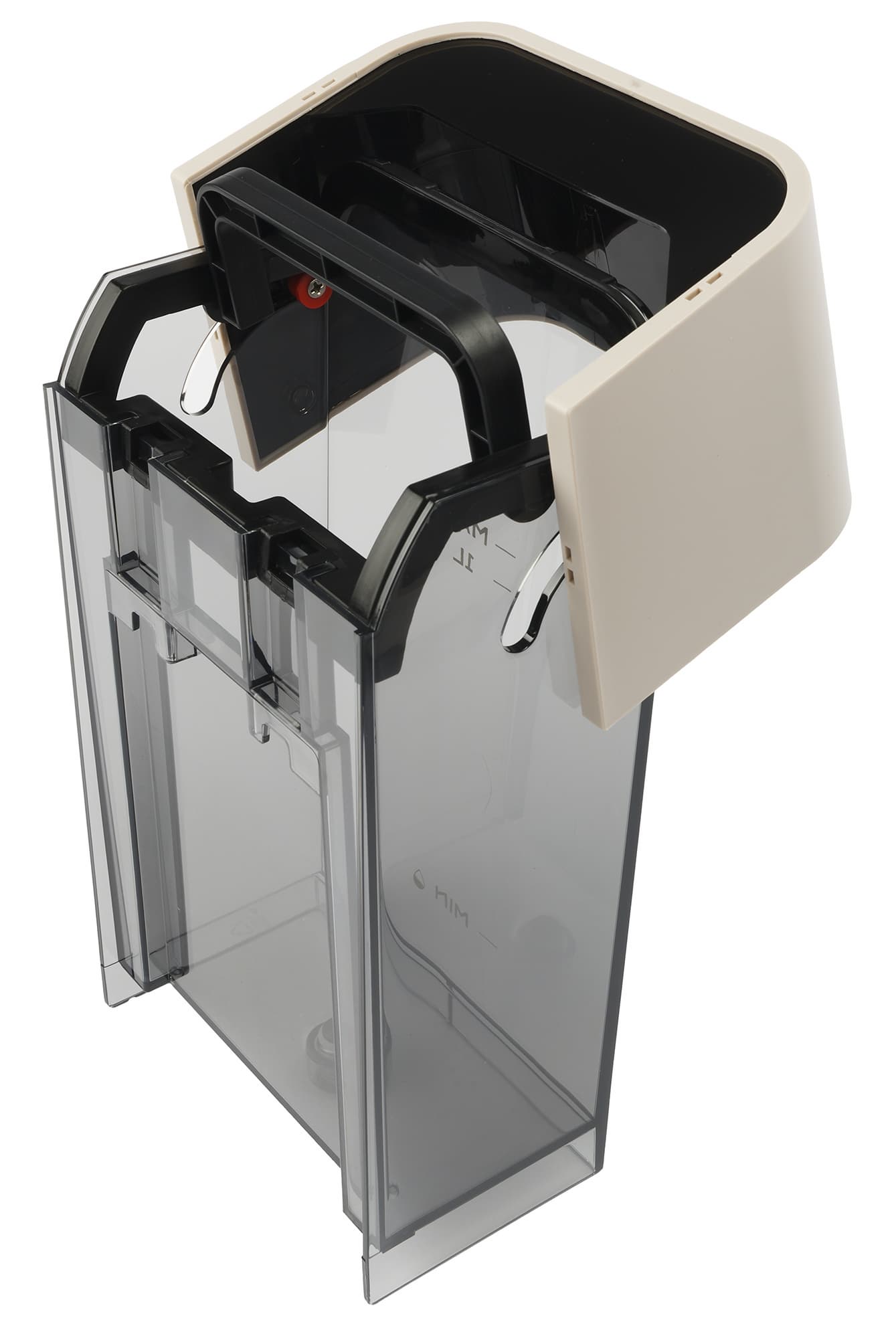 Съемный резервуар для воды находится в задней части прибора. Что удобно — резервуар для воды не нужно снимать, чтобы долить воду, достаточно просто откинуть крышку. Резервуар выполнен из полупрозрачного пластика, что позволяет визуально следить за уровнем воды, и снабжен отметками min и max. Объем резервуара чуть больше 1 литра.