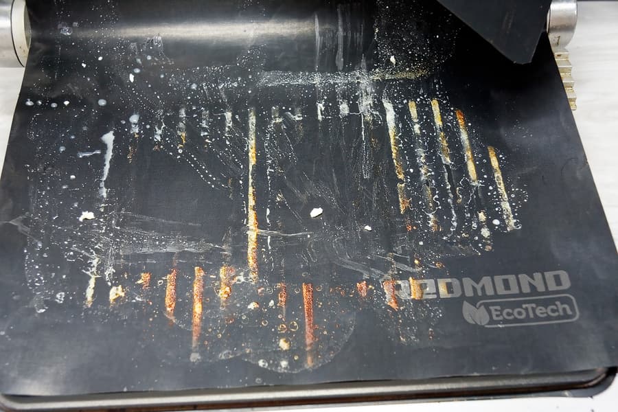 Что касается использования покрытия вместе со сковородой, то рациональность этого сценария, признаться, вызывает у нас некоторые сомнения. На наш взгляд, «спасать» сковороду с облезшим антипригарным покрытием с помощью накладного антипригарного покрытия — не самое удачное решение. Проще купить новую. Тем более, что при таком использовании аксессуара все равно присутствует вероятность протечки по краю коврика, а следовательно, вы окажетесь перед необходимостью мыть и сковороду тоже. Однако мы вполне допускаем, что кому-то такое применение Redmond Ecoglass MC1 покажется вполне уместным.