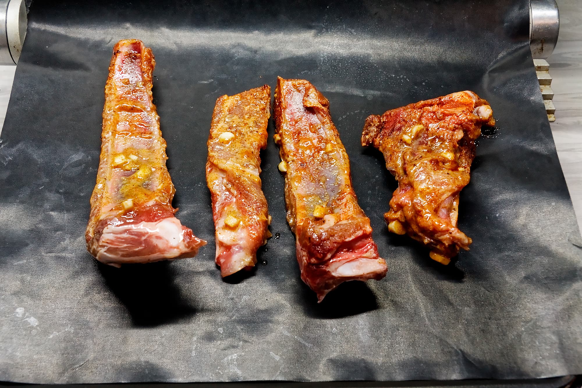 Redmond предлагает приготовить свиные ребра в гриле. Отчего нет? Мы взяли свежие ребрышки, замариновали их в соусе (горчица, мед), добавили нарезанный чеснок и специи и отправили их в холодильник. Спустя несколько часов достали и выложили на гриль, предварительно постелив наше покрытие.