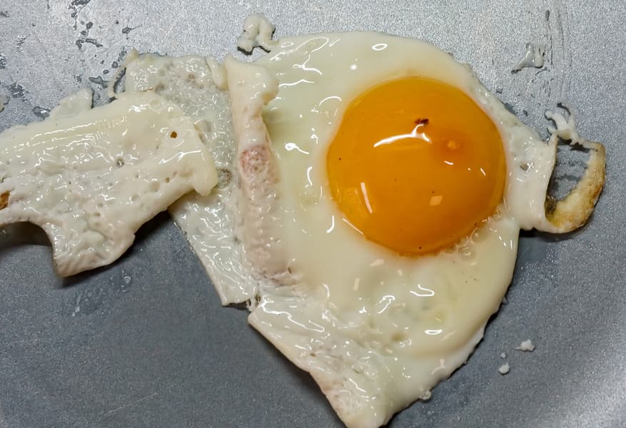 Идеальная по консистенции (но не по форме) яичница-глазунья из одного яйца идеально прожарилась и без проблем переместилась на тарелку при помощи силиконовой лопатки.