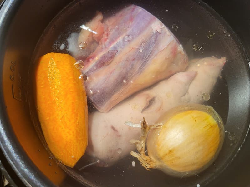 С холодцом в мультиварке-скороварке все достаточно просто: положить мясо, добавить лук и морковь и включить режим «Томление» на 3 часа, написано в рецепте, но мы опять решили сделать по-своему и поставили будущий холодец томиться в мультиварке на 4 часа.