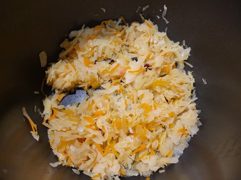 Но в процессе варки бульона нам всё же удалось разобраться с клапаном, поэтому квашеную капусту мы уже тушили как положено: крышка повернута в режим скороварки, паровой клапан закрыт, и за 10 минут, предусмотренных автоматической программой, капуста действительно стала тушеной.