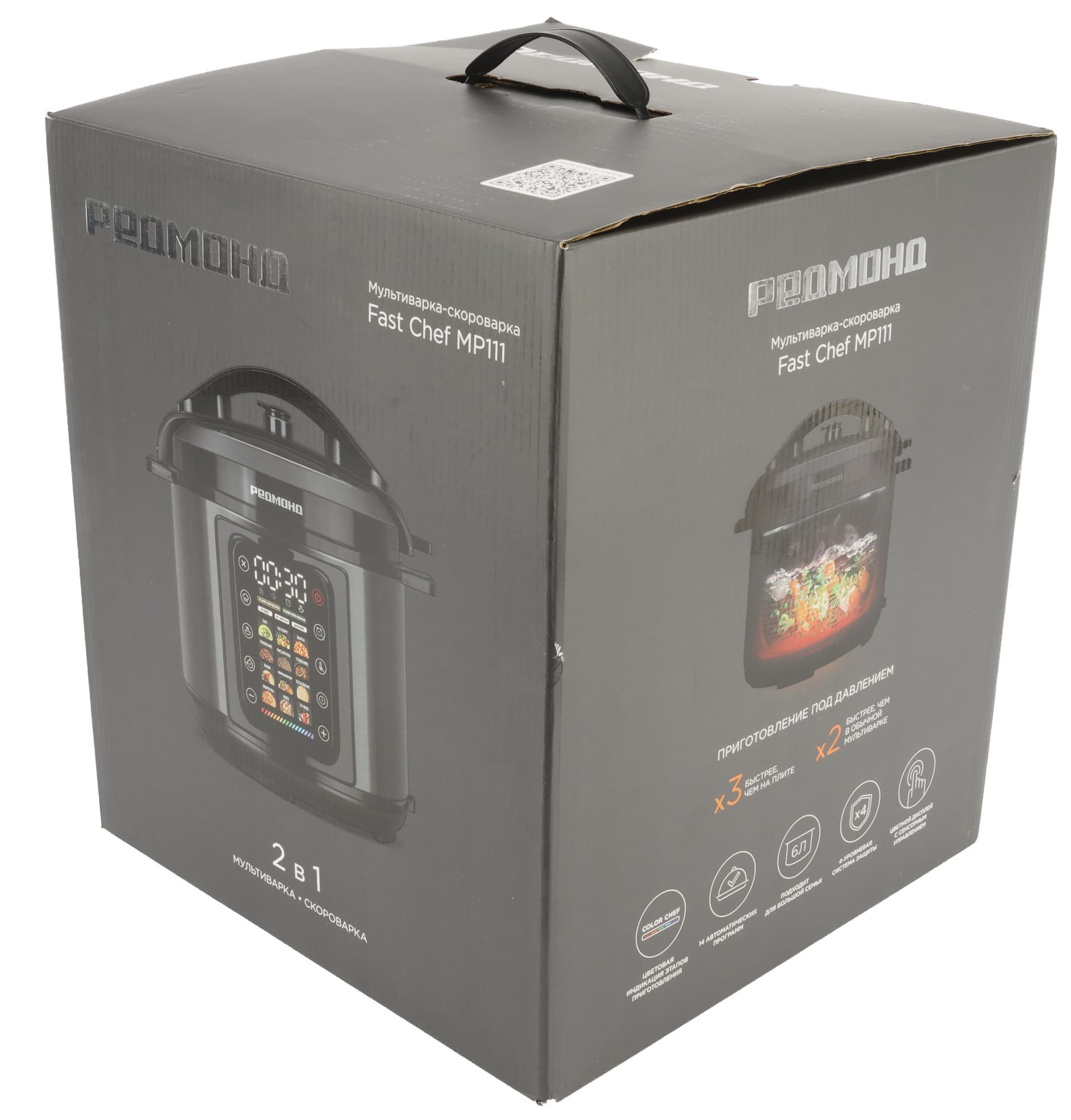 Коробка из приятного на ощупь матового картона с фотографией прибора снаружи, а также изображением прибора в процессе приготовления «в разрезе». На коробке также дается техническая информация о модели и ее особенностях: 14 автоматических программах, функции Color Chef, а также о том, что мультиварка-скороварка готовит в 3 раза быстрее, чем на обычной плите, и в 2 раза быстрее, чем мультиварка.