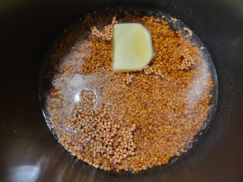 Итак, мы перевели паровой клапан в положение «открыто», взяли традиционную для приготовления гречки пропорцию 1:2 (стакан гречневой крупы, 2 стакана воды), отправили это всё в мультиварку и запустили программу «Экспресс».