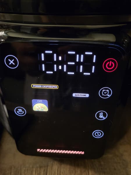 На фото ниже прибор вышел в рабочий режим скороварки, необходимое давление достигнуто, на дисплее — предустановленное время работы автоматической программы «Суп», скоро начнется обратный отсчет времени до окончания программы.