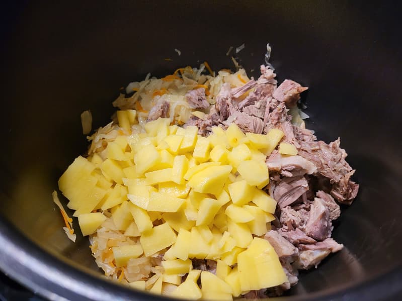 Дальше к тушеной квашеной капусте мы добавили порезанную картошку и мясо, снятое с костей. Морковку отдельно добавлять не стали, поскольку она уже есть в квашеной капусте.