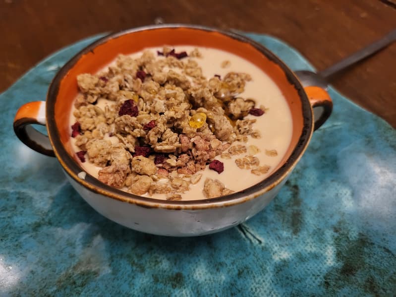 В общем, через четыре часа ряженка была готова. Мы отправили ее на ночь в холодильник дозревать, а утром достали, добавили гранолы и меда и, как вы догадываетесь, немедленно съели.