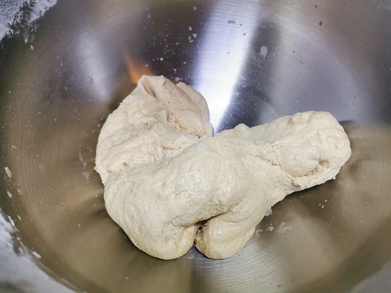 Мы добавили еще 30 мл теплой воды, прошлись силиконовой лопаткой по краям дежи, чтобы стряхнуть налипшее тесто и разместить его в центре, и запустили работу миксера еще на 2 минуты.