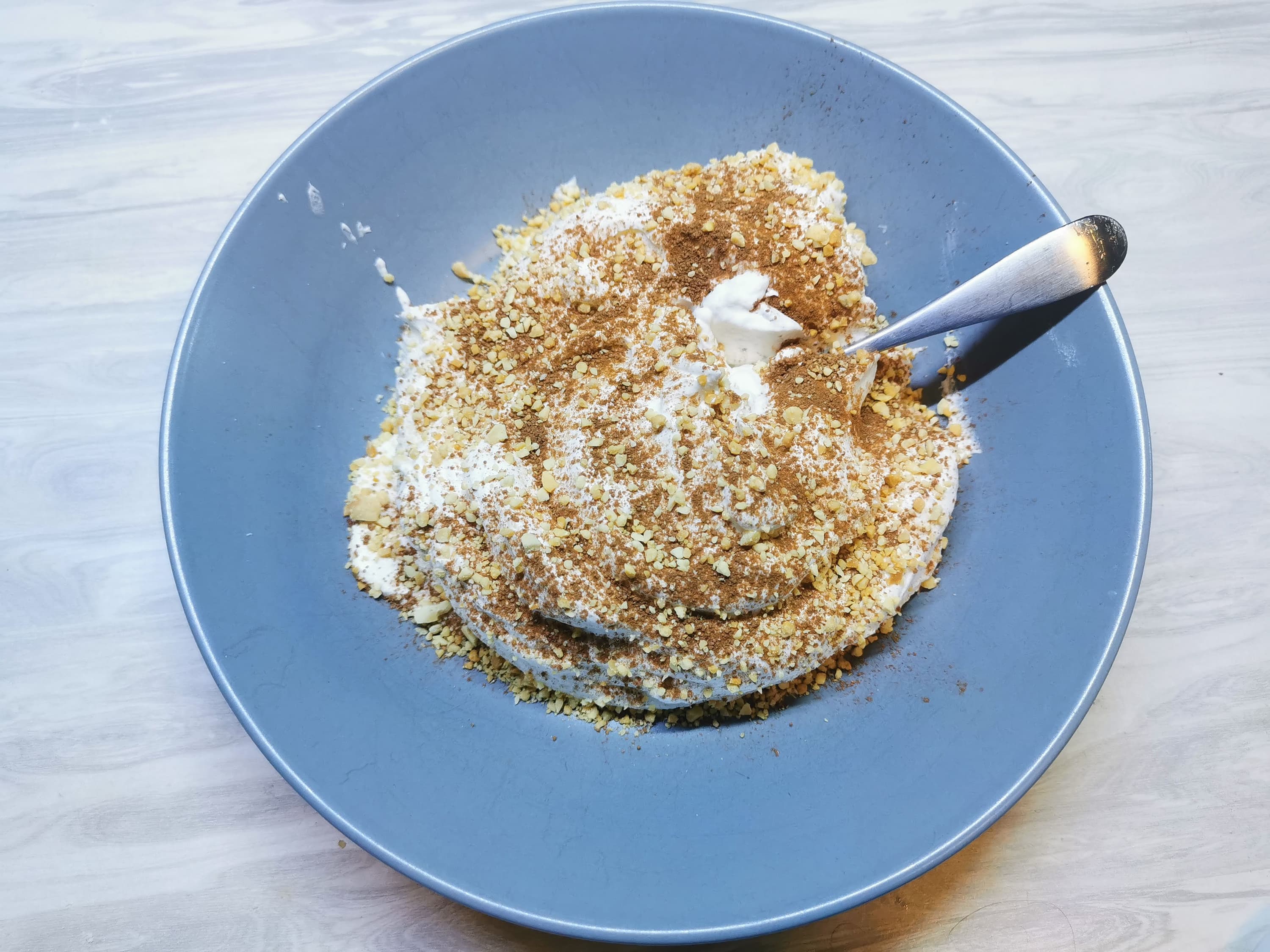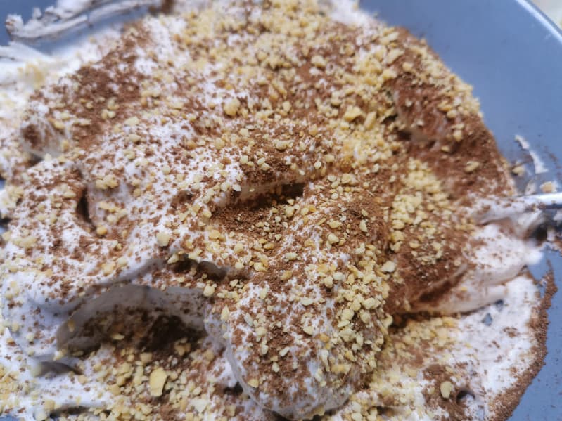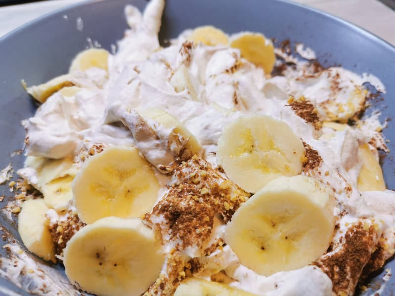 Мы любим взбивать сливки без сахара и уже после загустевания добавлять сладкие топинги. Поэтому готовым блюдом у нас стали сливки с дробленным арахисом, шоколадной крошкой и спелым бананом.