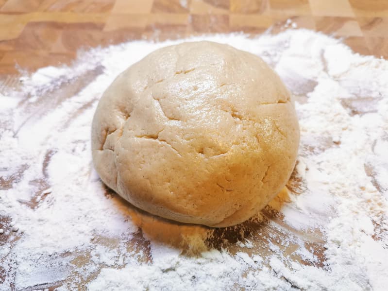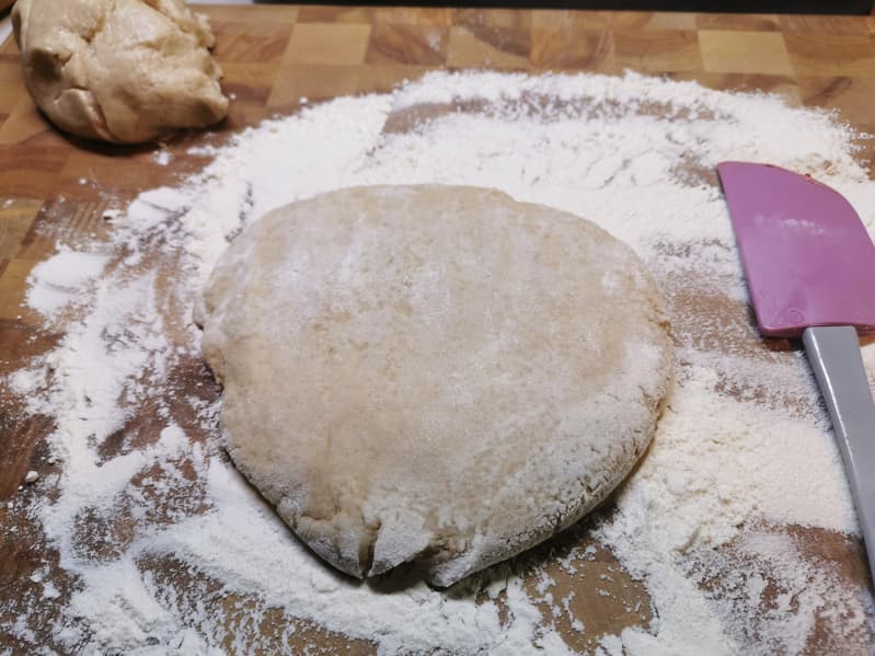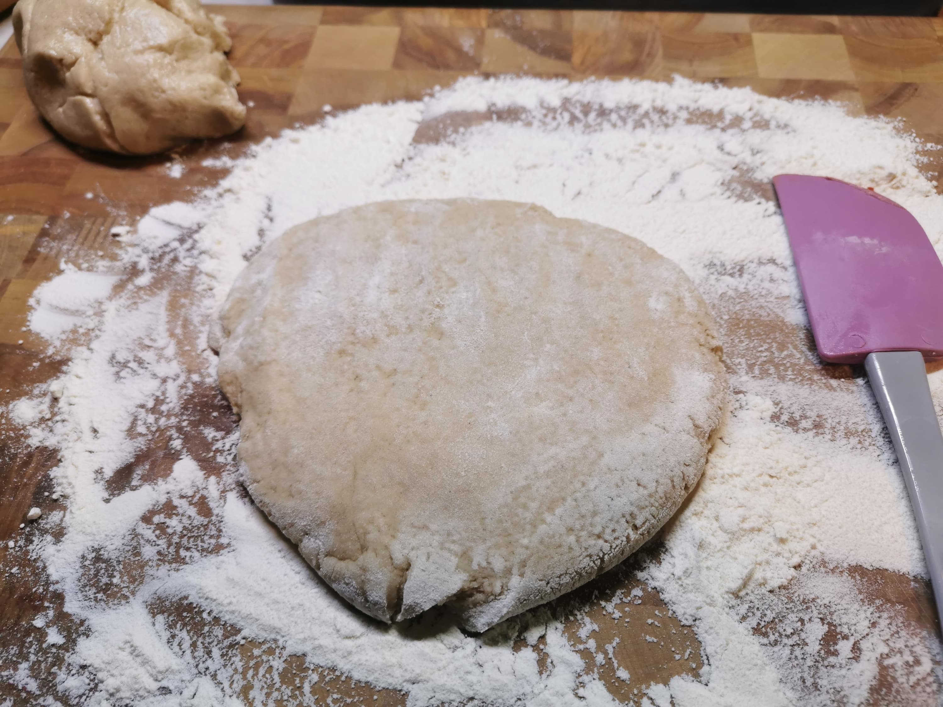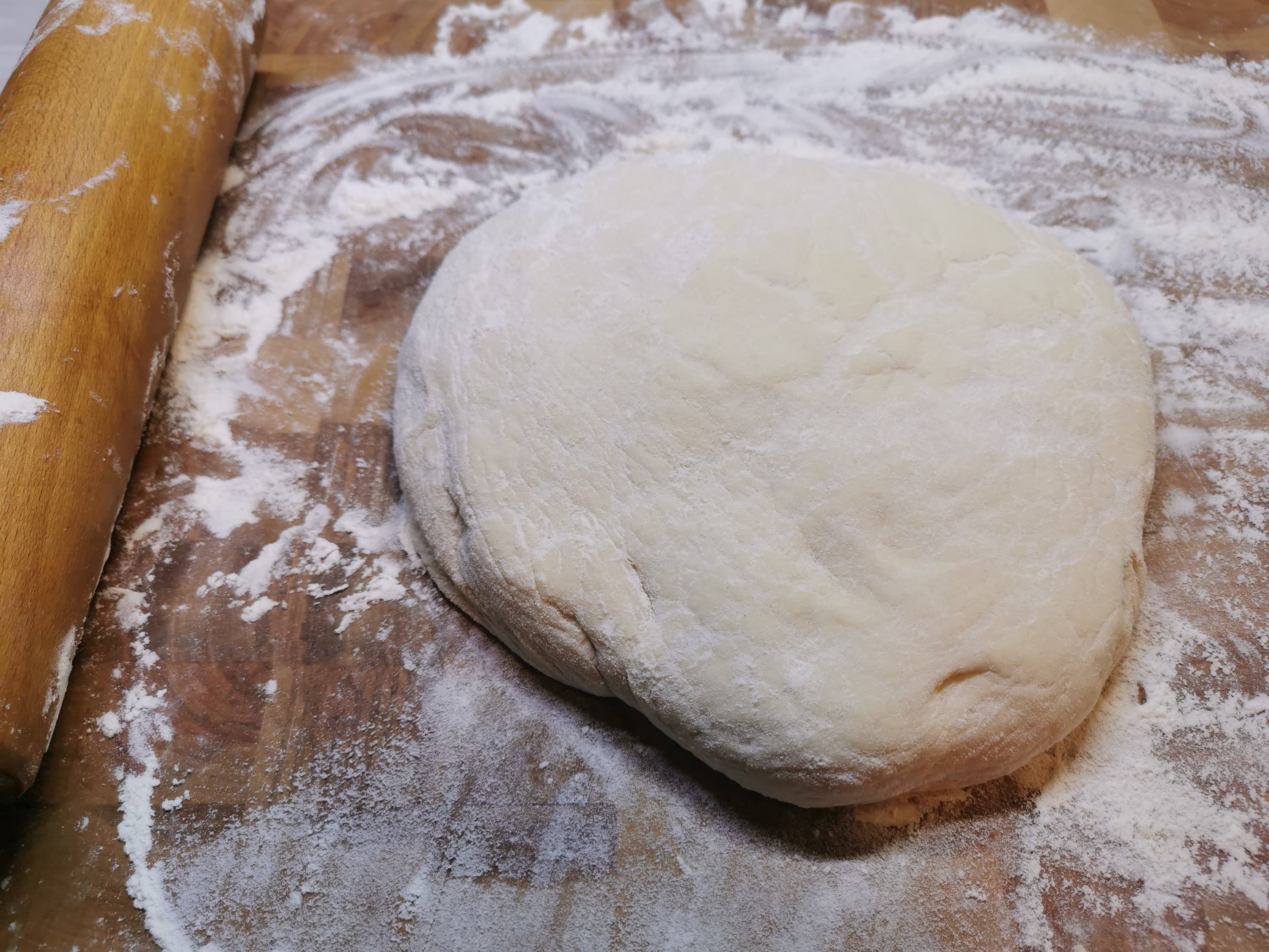 Мы хорошенько посыпали рабочую поверхность мукой и вываляли в ней наше тесто со всех сторон.
