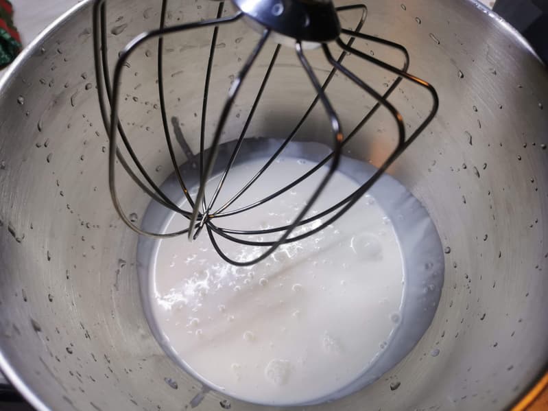 Мы вылили все 200 мл в чашу миксера и начали их взбивать сразу на 8-м режиме, а как только сливки слегка загустели и уже не брызгались, мы перешли на 10-й режим.