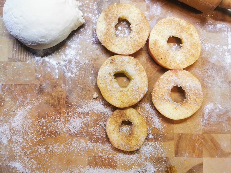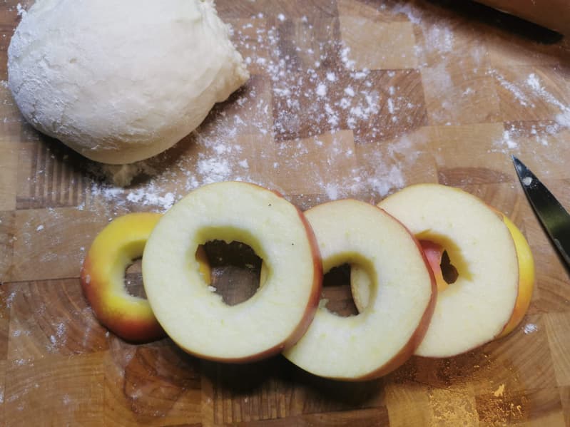 После пробы сосисок мы приступили к приготовлению второго блюда — яблок в тесте с корицей и сахаром.