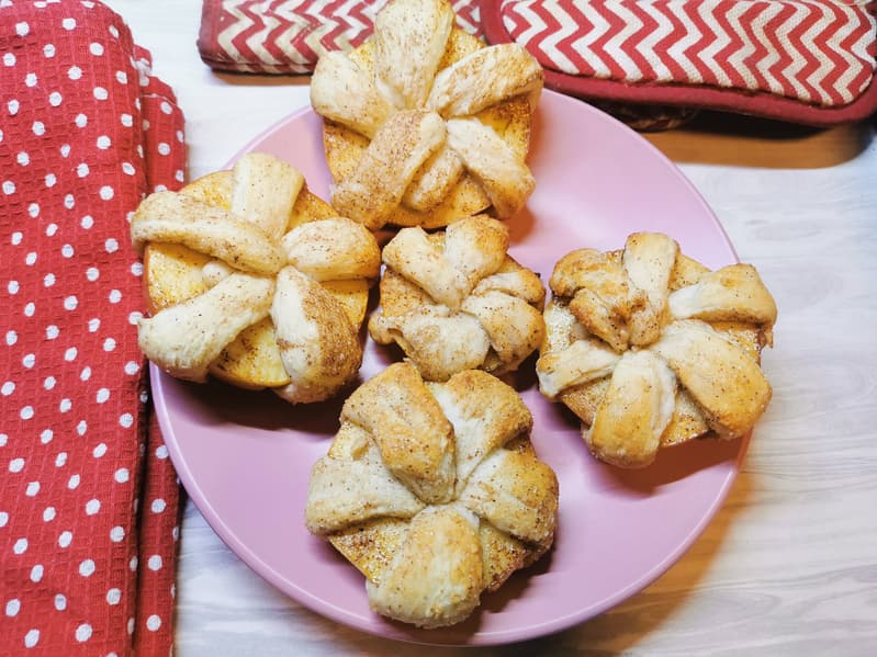 Но получили! Яблоки пропеклись, тесто подрумянилось, сахар карамелизовался, и вся наша кухня пахла корицей. Получилось очень просто и еще более вкусно.