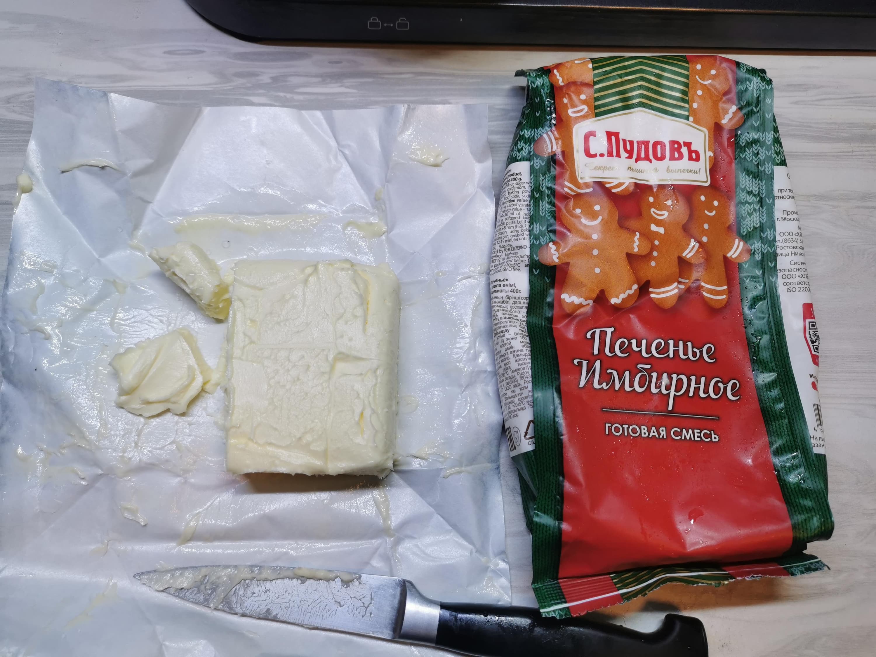 Нам понадобилось 120 г сливочного масла, 50 мл теплой воды и упаковка готовой смеси для имбирного печенья.