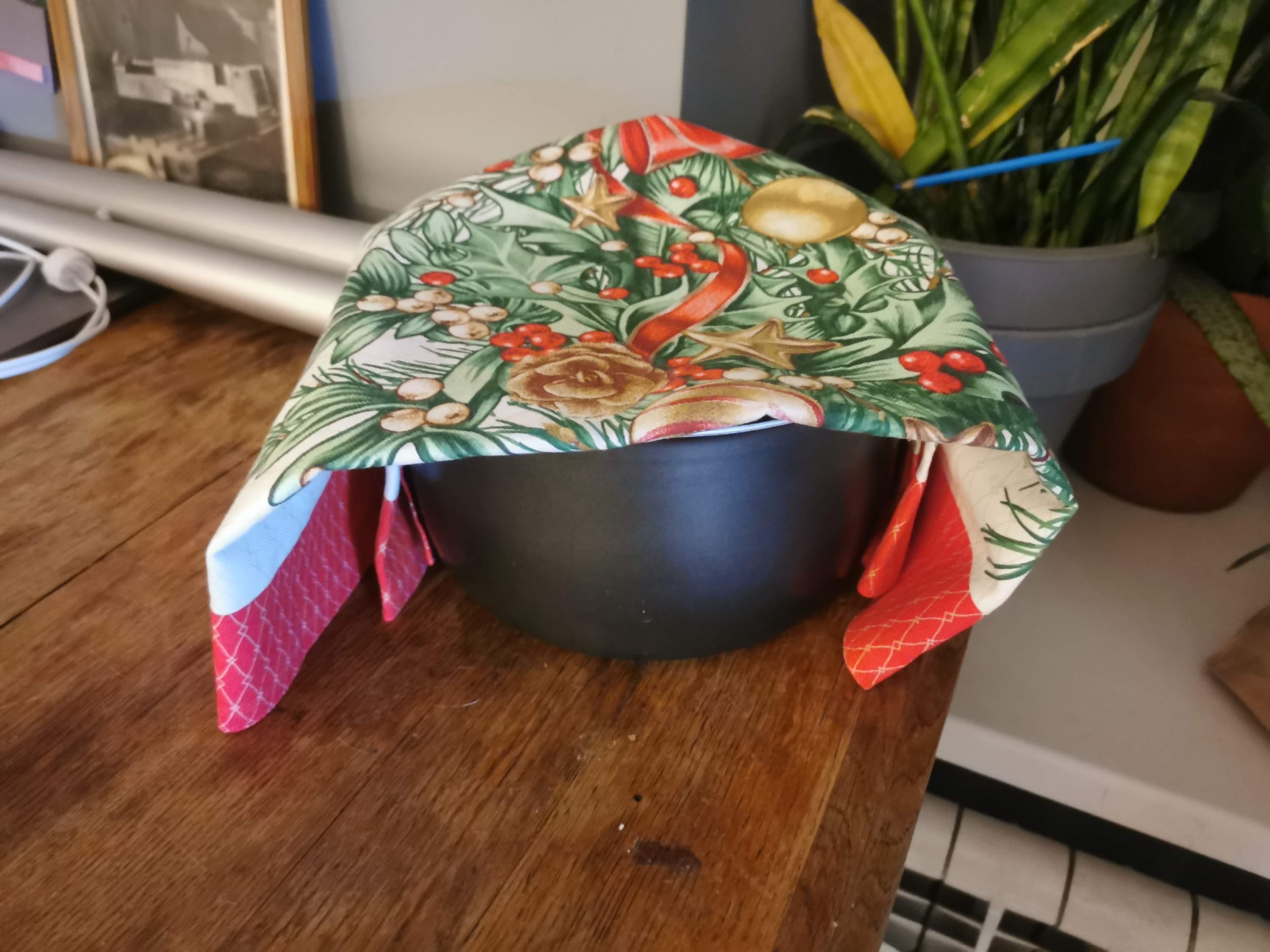 Мы откинули верхнюю часть тестомеса и подождали, пока тесто само сползет с крюка, после чего переложили его в кастрюлю, накрыли полотенцем и поставили в теплое место на час.