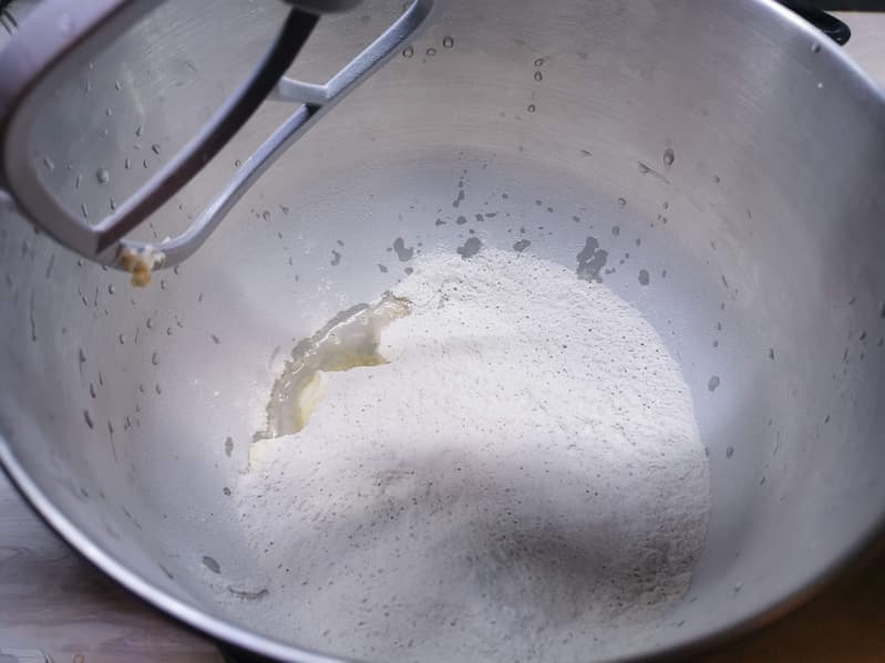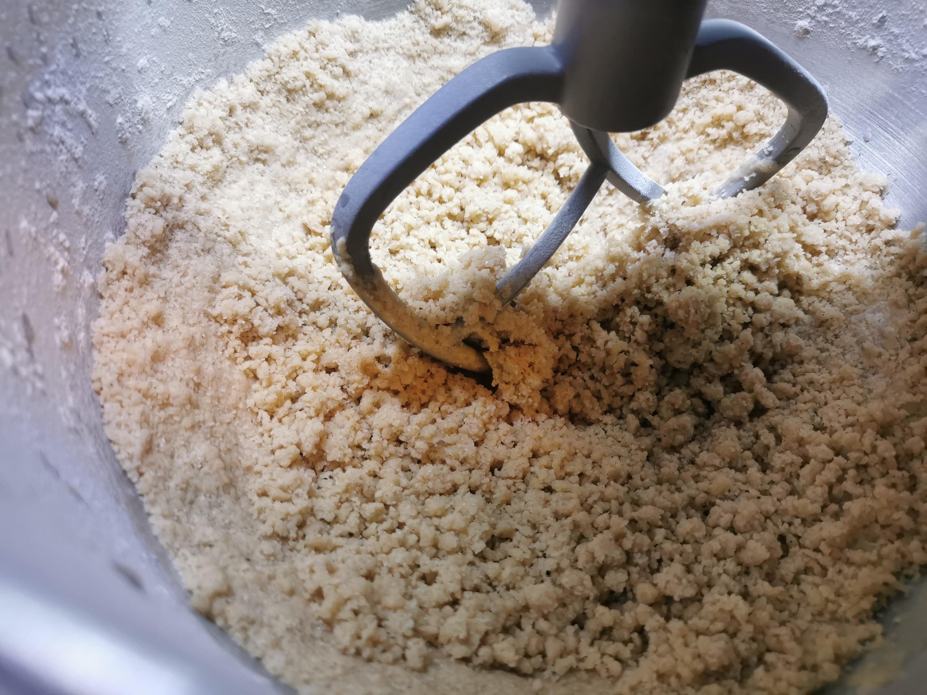 Сначала мы решили, что насадка для смешивания плохо справляется со своей задачей, так как вместо однородного теста мы получили множество песочных крошек и налипший слой по периметру дежи. Но вовремя поняли, что тесту просто не хватило жидкости, хотя по инструкции на упаковке мы добавили максимальное количество.