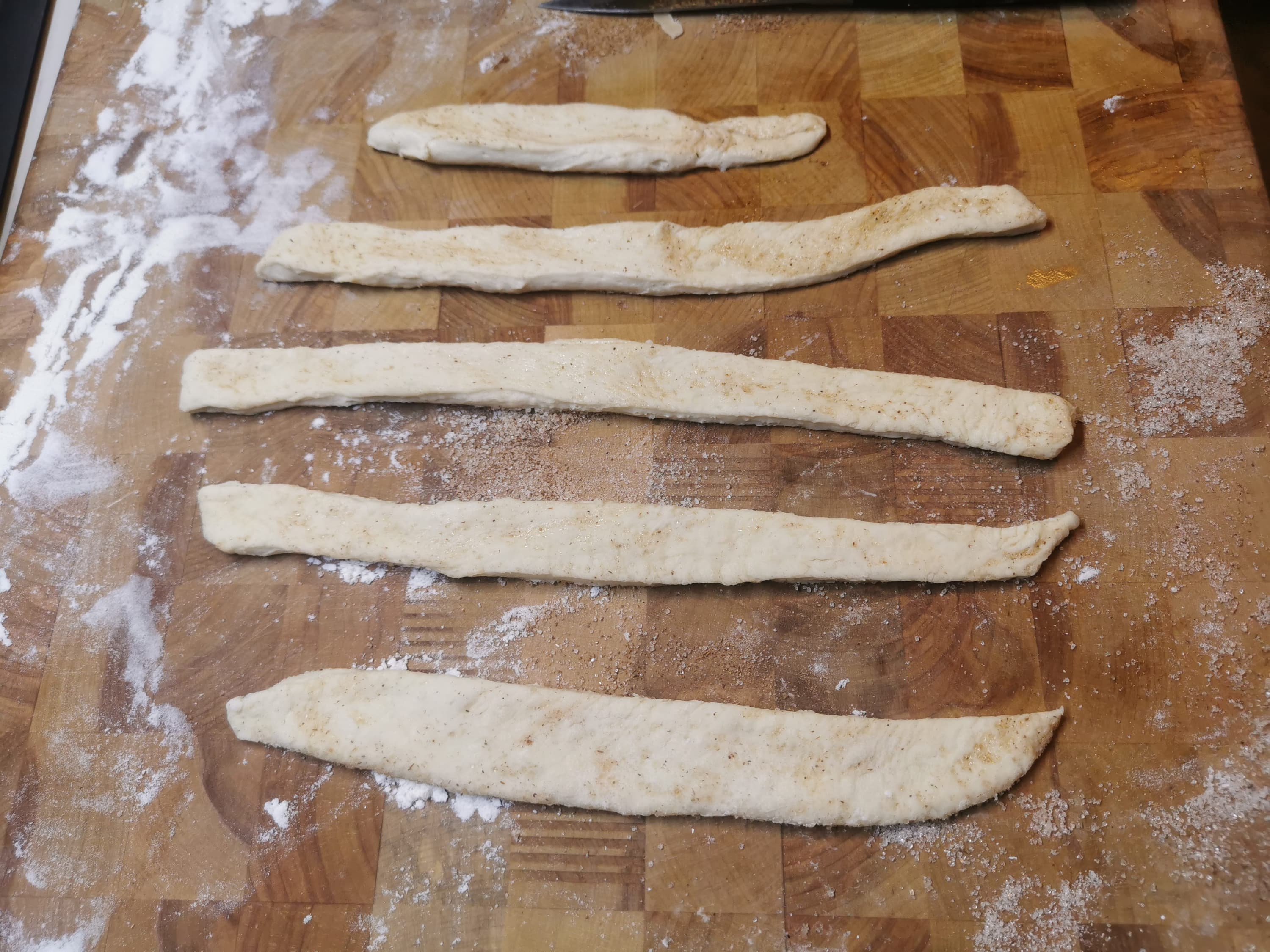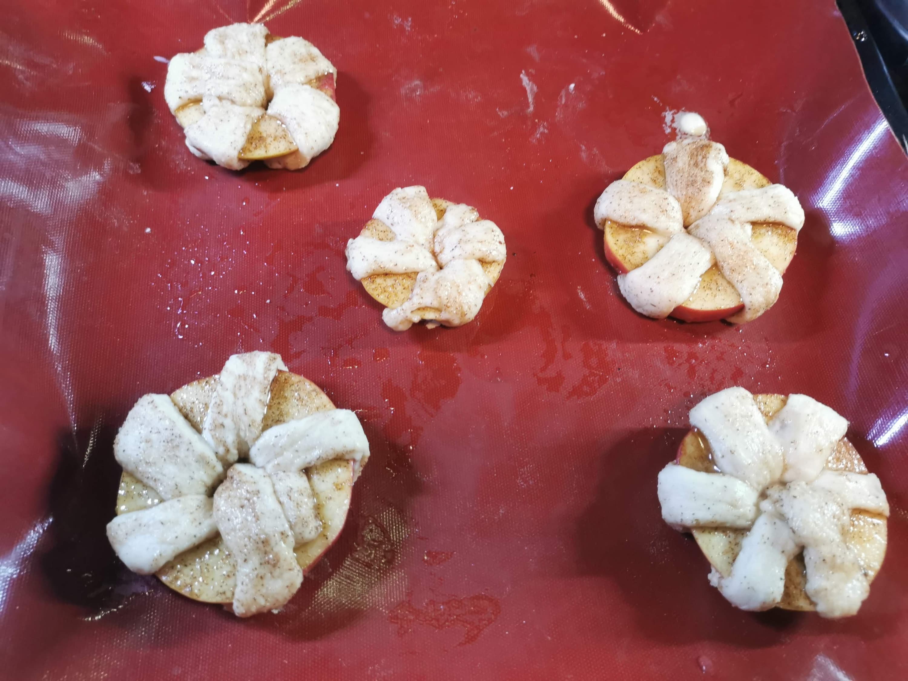 Тесто мы раскатали и также обваляли с обеих сторон в корице с сахаром. После чего порезали остаток теста на 5 полосок разного размера и принялись аккуратно обматывать каждый яблочный диск тестом.