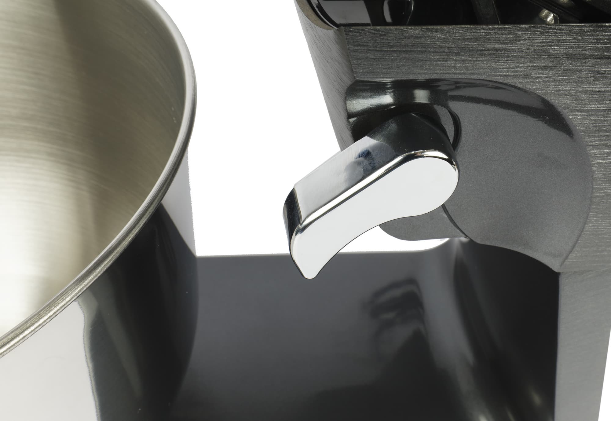 Конструкция прибора также классическая — неподвижное основание, с гнездом для крепления дежи, откидная часть с валом для крепления насадок и сенсорным дисплеем, и рычажок блокировки откидной головки в нижней правой части корпуса. Единственное отличие, на которое нельзя не обратить внимание — тонкая ножка корпуса, соединяющая верх и низ устройства.