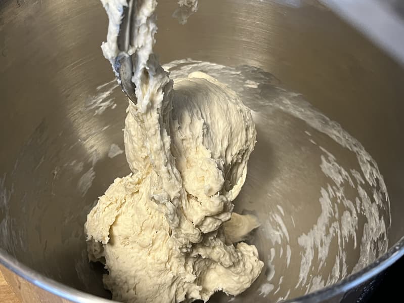 Не трогая ингредиенты, установили насадку-крюк, поставили дежу в основание миксера и запустили работу на 3-й скорости.