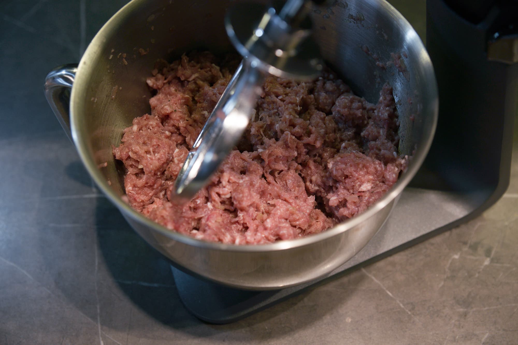 Всего в емкости находилось 2 кг фарша. Такой объем был тщательно перемешан на 2-й скорости всего за пару минут.