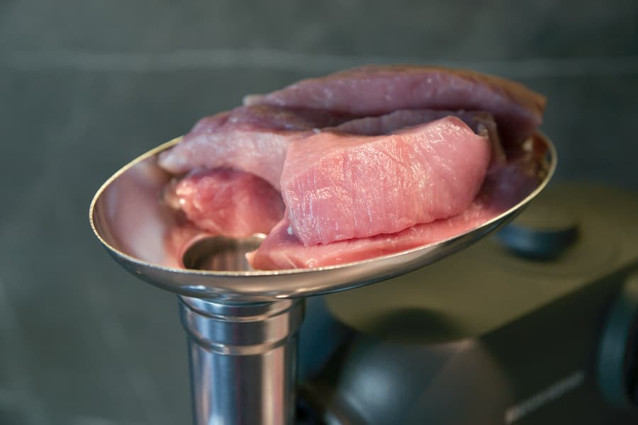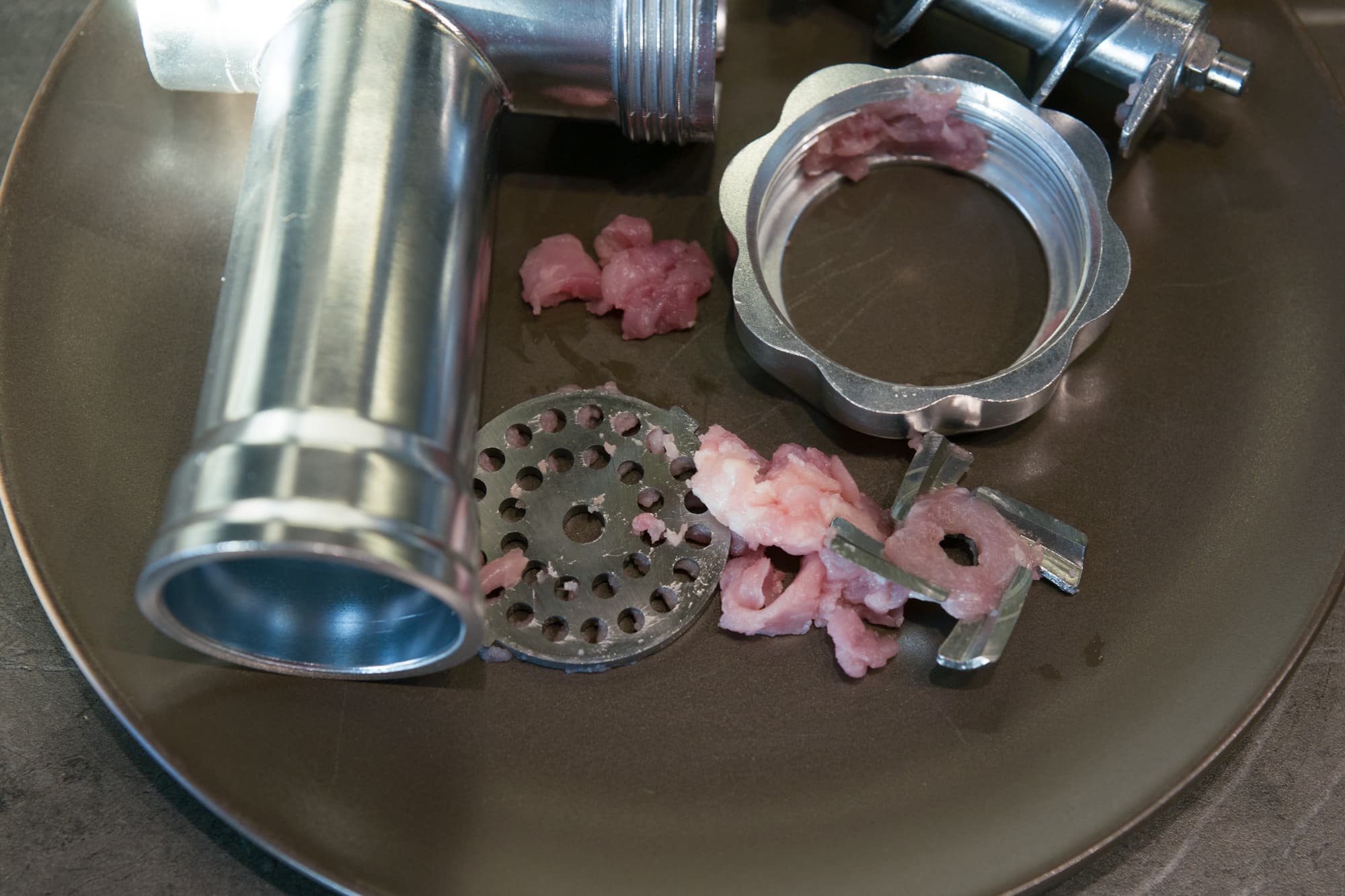 С килограммом свиного окорока комбайн расправился за 1 минуту 10 секунд. Решетку использовали среднюю. Прибор работал на рекомендованной для мясорубки 6-й скорости. Толкатель подключили к работе всего пару раз, особой надобности в нем не было.