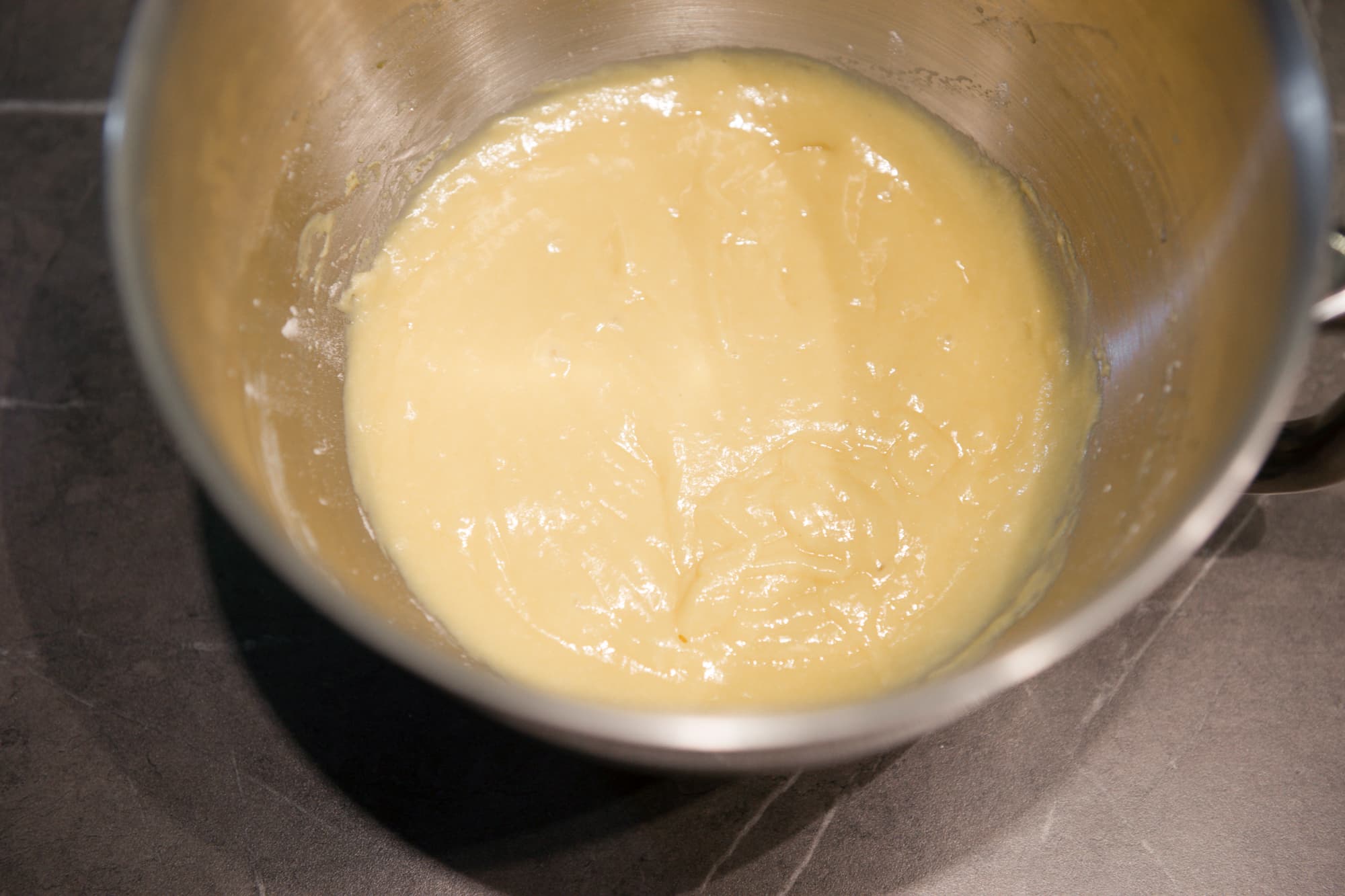 В чашу разбили пару яиц и включили комбайн сначала на второй скорости, затем, постепенно подсыпая сахар, перешли на четвертую и в конце на шестую. В процессе влили растительное масло и свежевыжатый лимонный сок. К концу четвертой минуты масса заметно увеличилась в объеме и стала воздушной. Переключили скорость на вторую и постепенно всыпали предварительно просеянную и смешанную с разрыхлителем и солью муку. Венчик аккуратно вмешал сухие ингредиенты в яичную массу. Один раз пришлось приостановить работу, чтобы собрать со стенок чаши ободок незахваченного теста. На этот этап потребовалось 3 минуты.