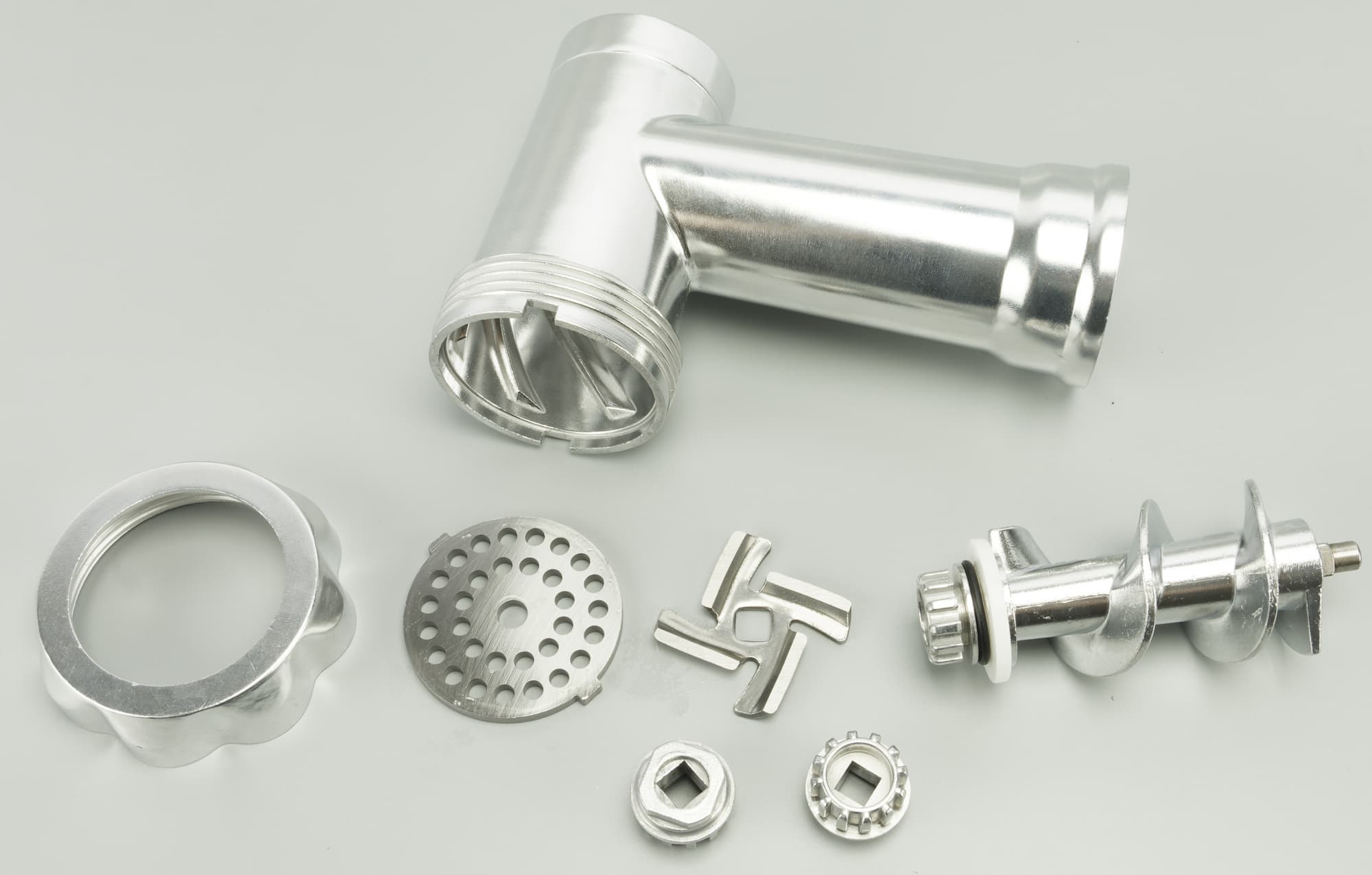 В комплекте прибора предусмотрены две запасных втулки для вала шнека. Корпус мясорубки выглядит стандартно: горловина, кольцевая гайка и шнек из алюминиевого сплава, нож и решетки — стальные.