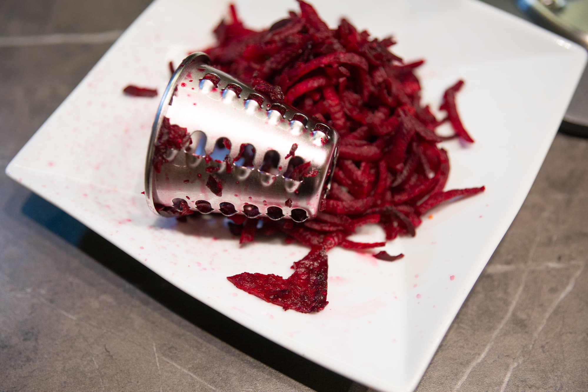 В этом тесте комбайн работал на пятой, рекомендуемой для овощерезки скорости. Начали со свеклы. Небольшие корнеплоды пришлось нарезать на две, а некоторые — на четыре части. Сначала мы опробовали крупную терку. Машина легко измельчила твердые овощи и выдала ювелирную стружку. 100 г были обработаны за 30 секунд.