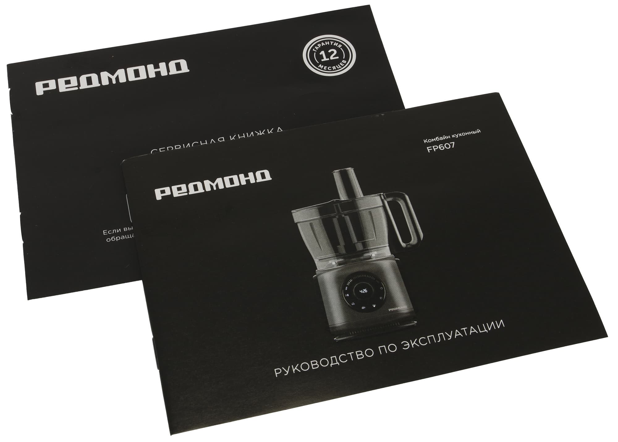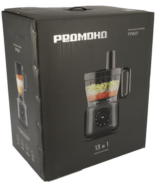 Комбайн поставляется в крупной коробке, оформленной в фирменном стиле Redmond. На темно-сером фоне размещены фотографии устройства, набора аксессуаров и их описание, а также технические характеристики. Для удобства переноски предусмотрена пластиковая ручка.