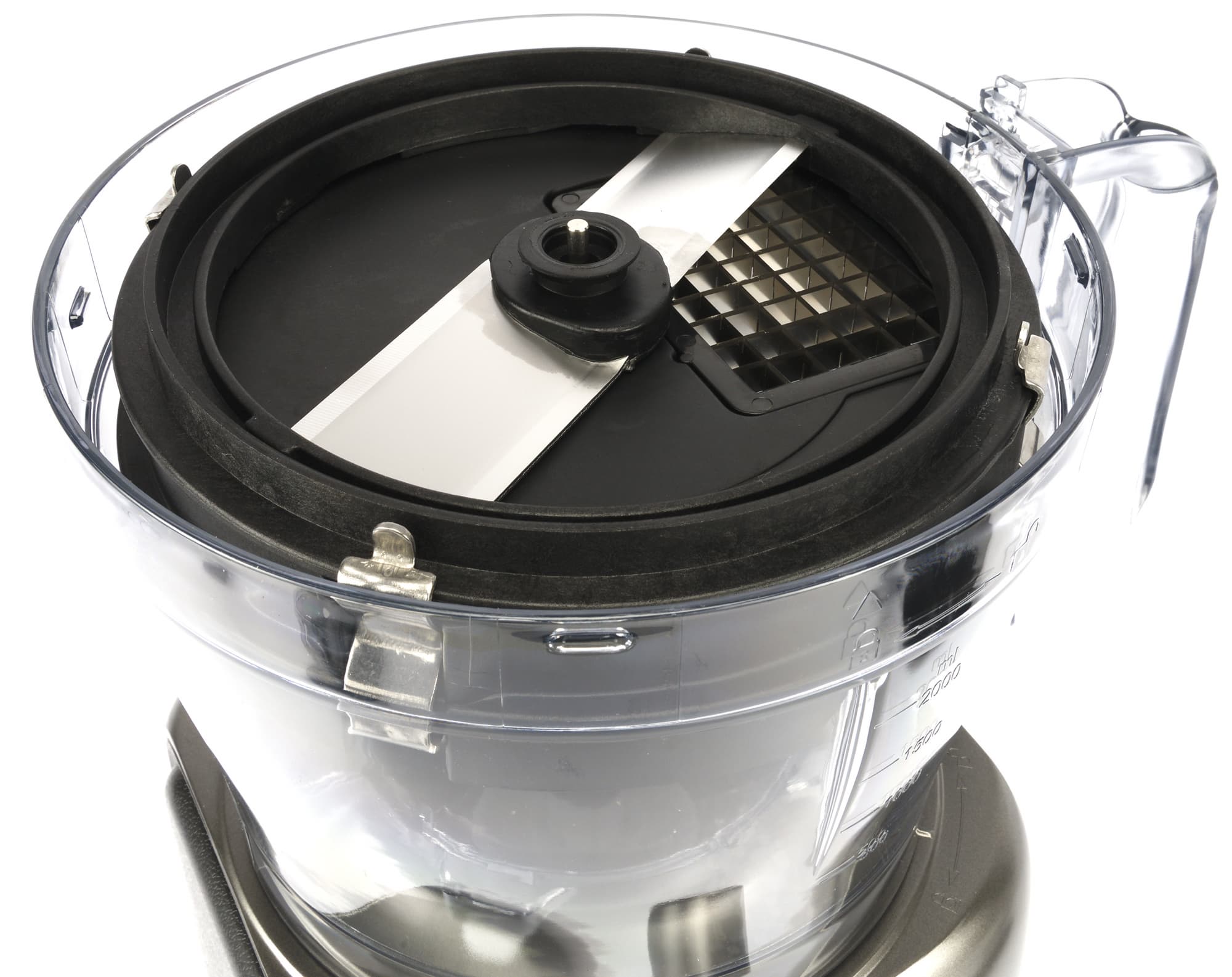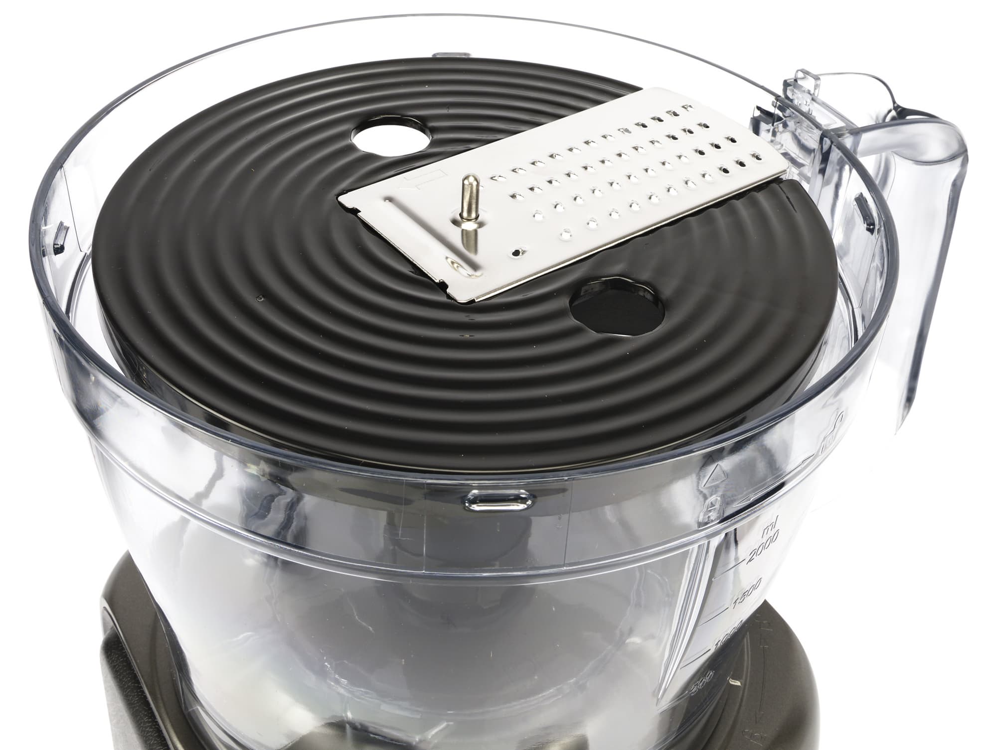 Все насадки крепятся в чаше с помощью съемной втулки, надетой на вал двигателя по центру. Конструкция фиксируется крышкой: нужно совместить выступ на краю рядом с загрузочной горловиной с пазом у ручки чаши и повернуть до щелчка по часовой стрелке. Крышка изготовлена из прозрачного пластика, оснащена горловиной для подачи продуктов. Высота горловины — 10 см, размеры загрузочного отверстия составляют 7,5×5,5 см. Толкатель, точно повторяющий форму и размеры отверстия, помогает подавать продукты непосредственно под режущие кромки.