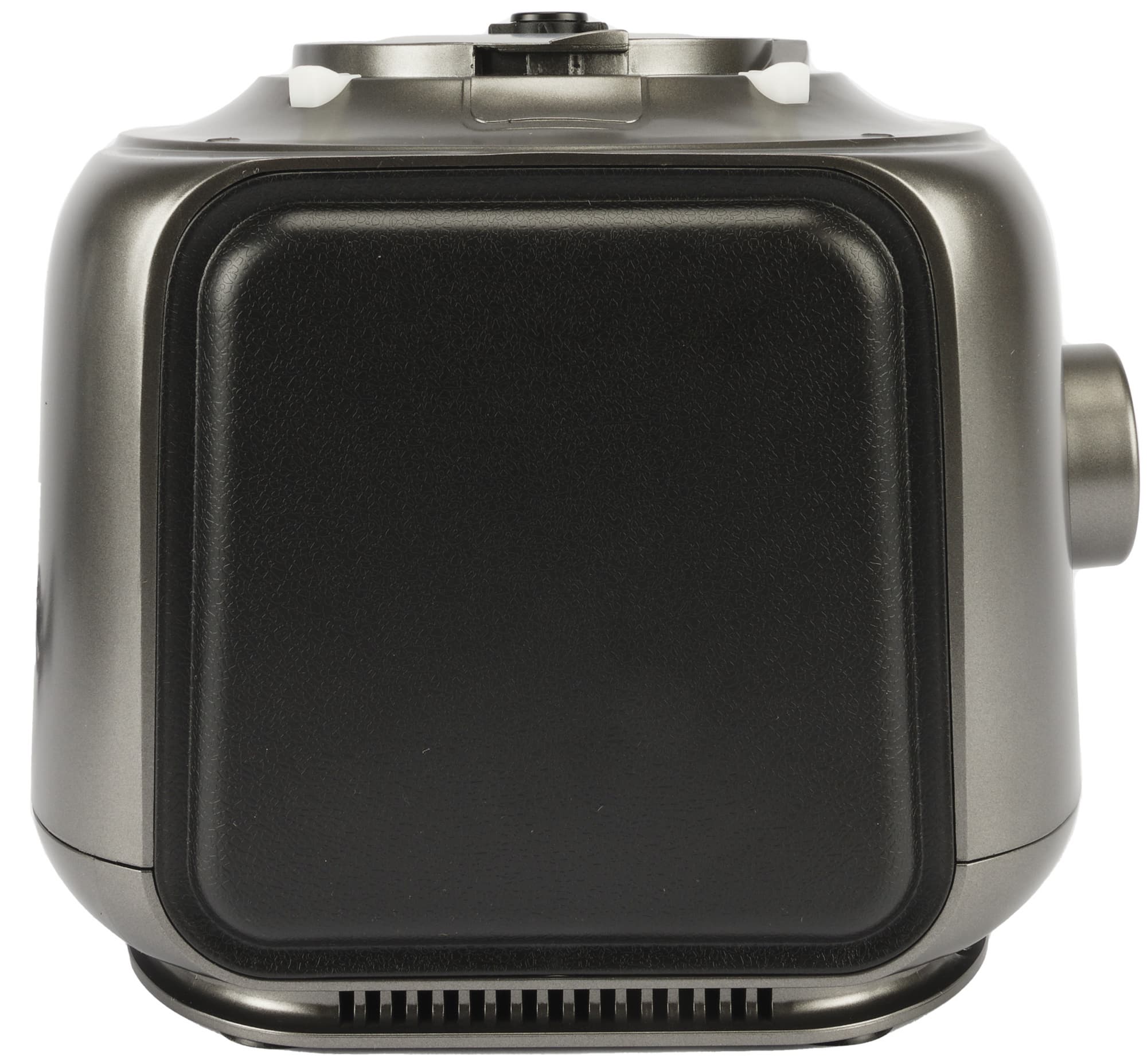 На лицевой стороне в центре располагается круглая панель управления с выступающим механическим регулятором скоростей и опоясывающей его сенсорной панелью чуть утопленной в корпус. В самом низу в углублении виднеется вентиляционная решетка.