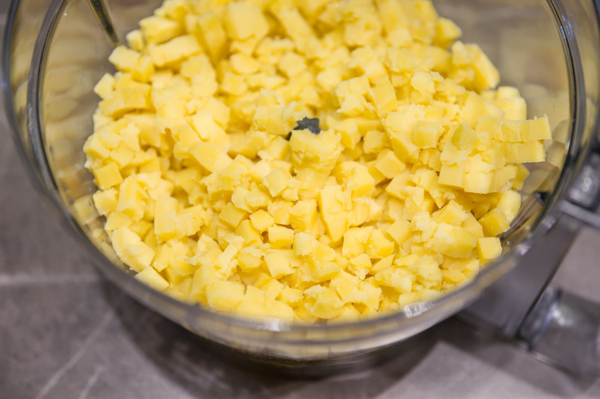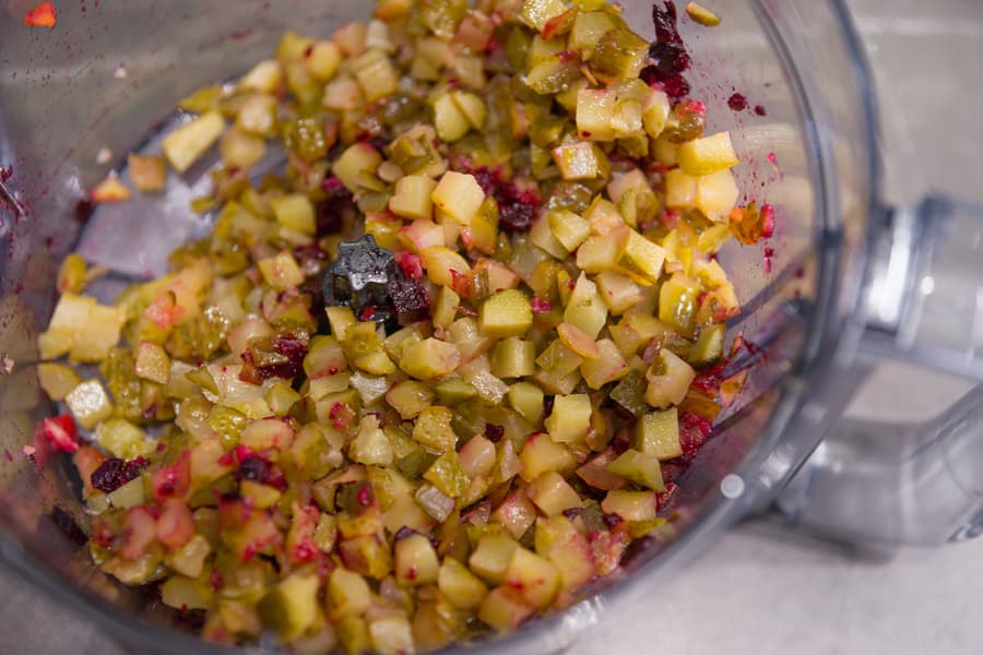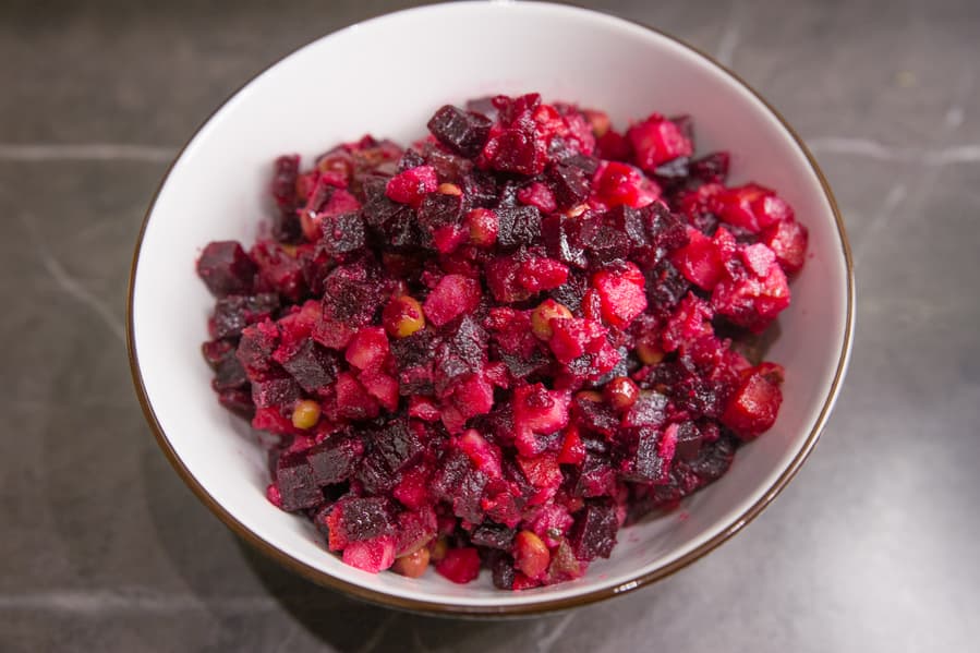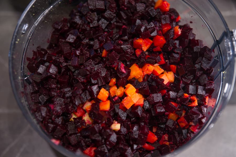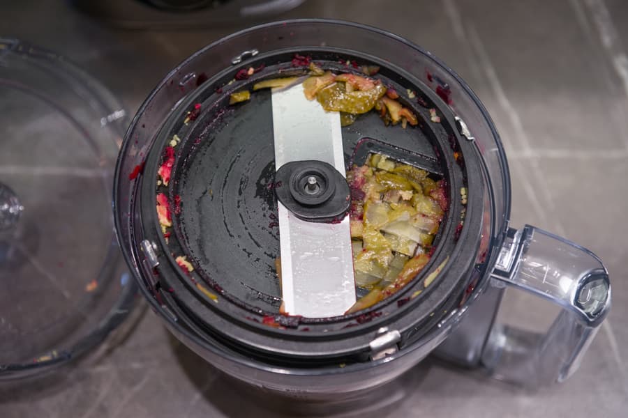 Для проверки насадки, режущей кубиками, мы подготовили вареные картофель, морковь и свеклу, маринованные огурцы и секундомер. Овощи не пришлось нарезать, среднего размера корнеплоды легко проходили в горловину, поэтому мы просто включили максимальную скорость и закидывали продукты внутрь один за другим.