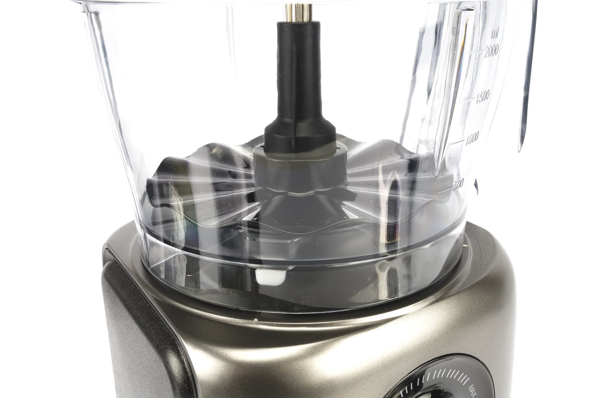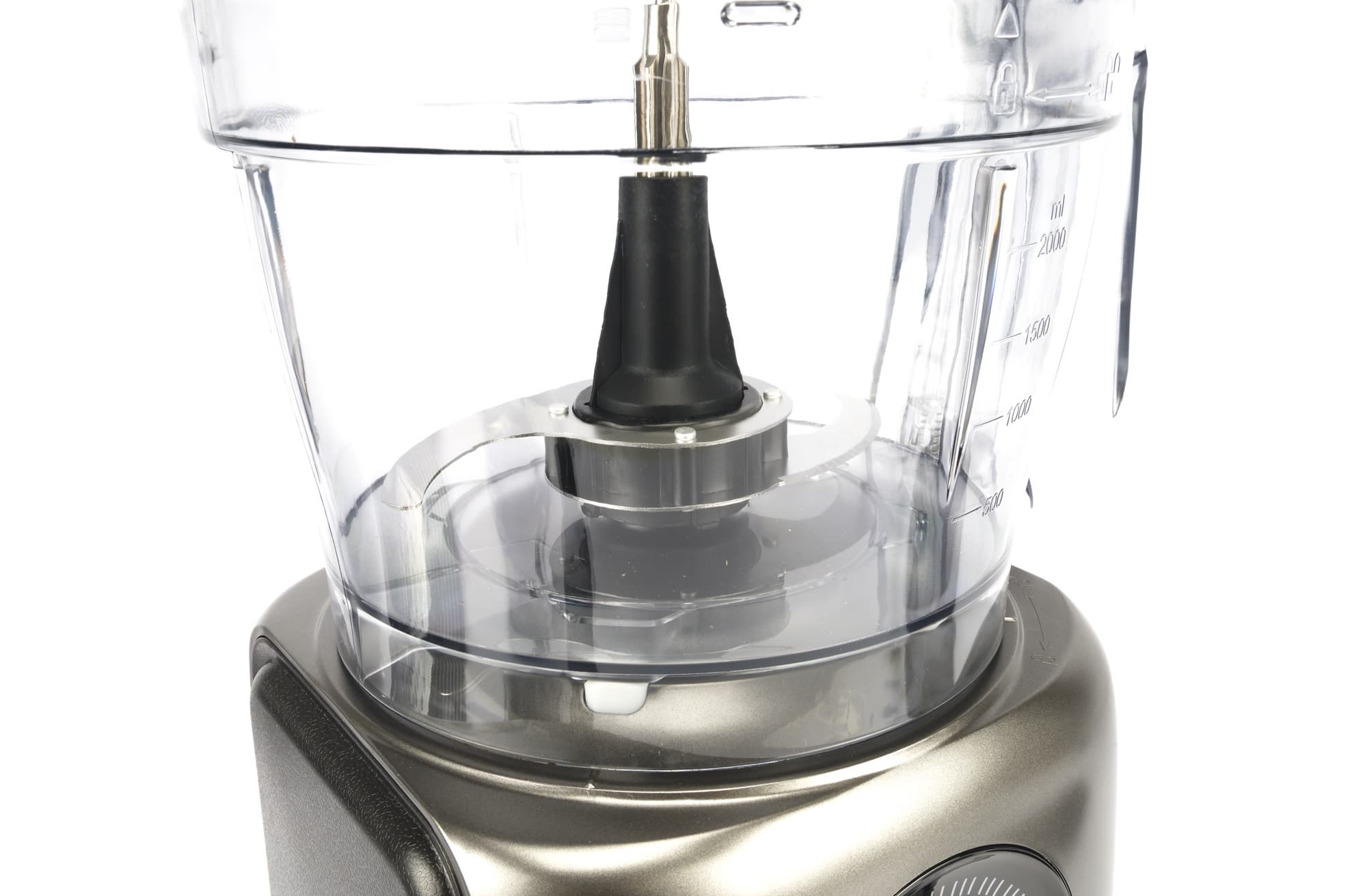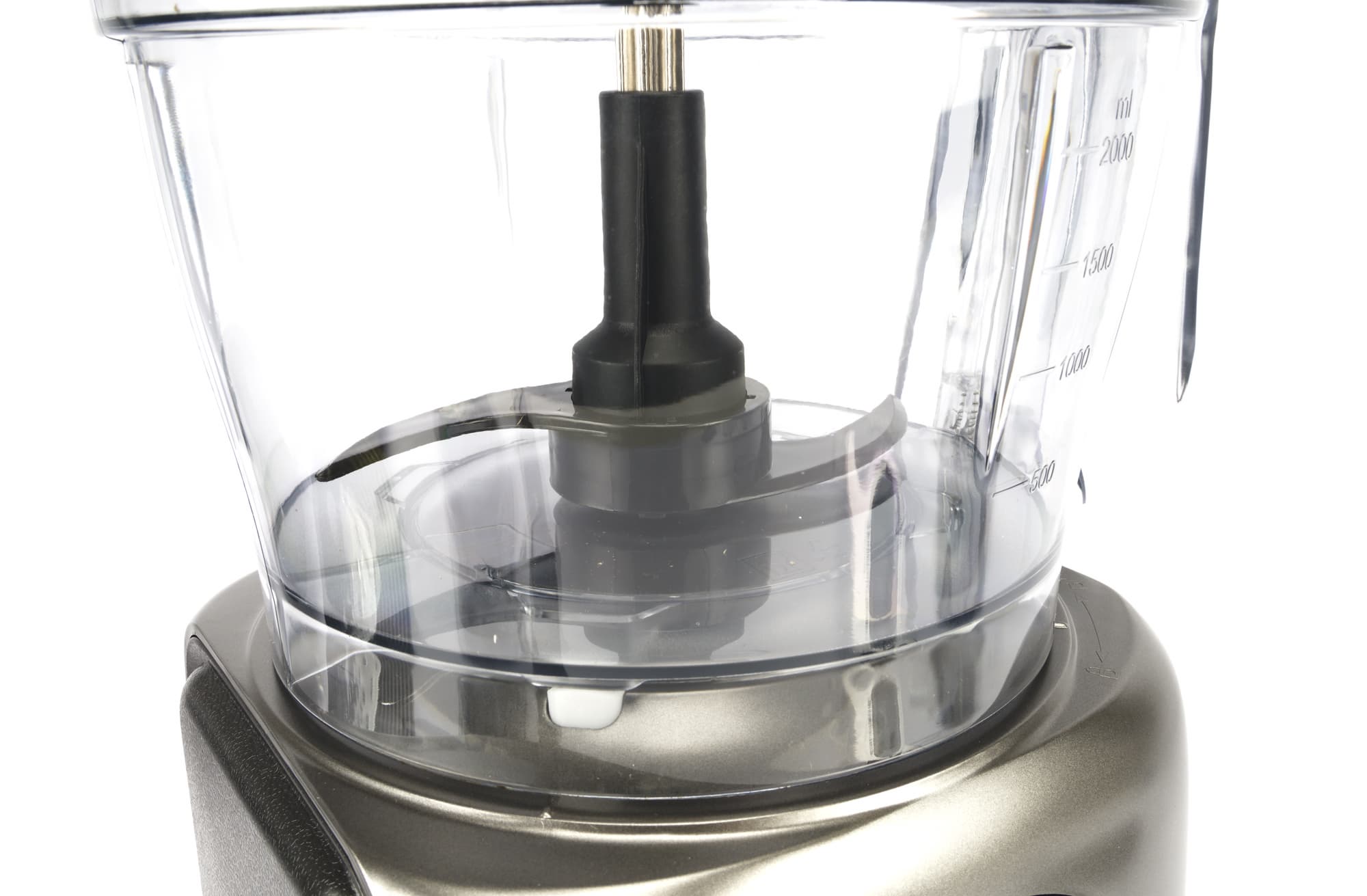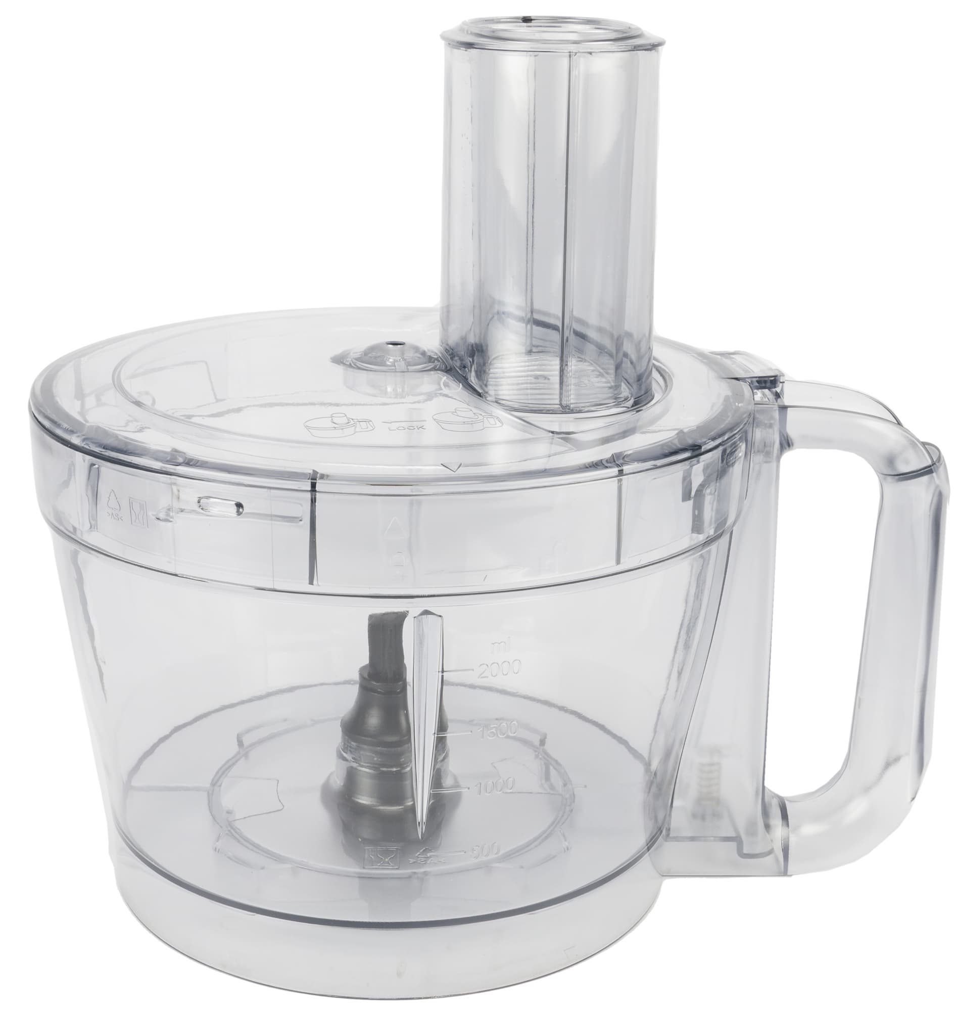 Чаша комбайна имеет солидный рабочий объем в 2000 мл. Емкость, как и кувшин блендера оснащена крупной удобной ручкой. Вес чаши небольшой, держать ее удобно. На стенках емкости есть отметки объема от 500 до 2000 мл с шагом 500 мл.