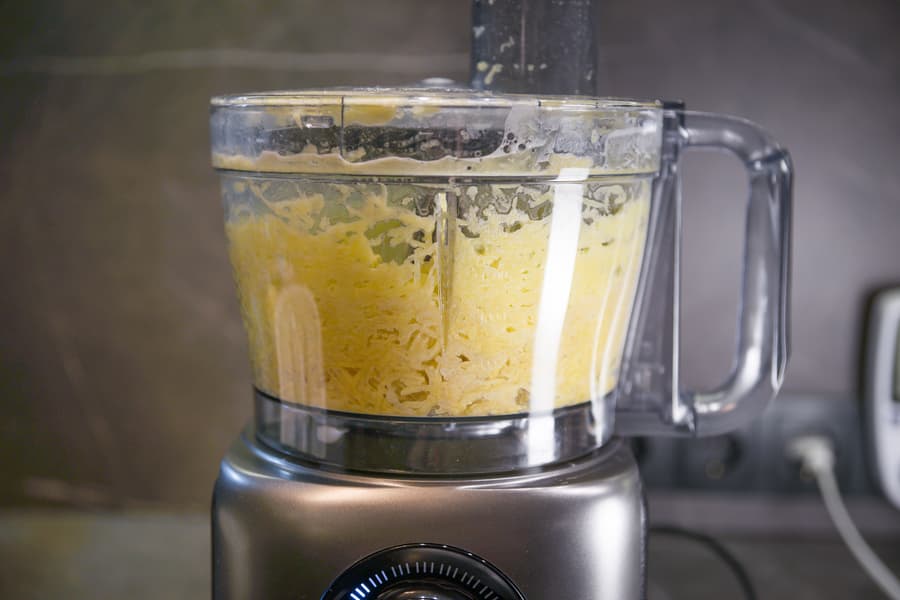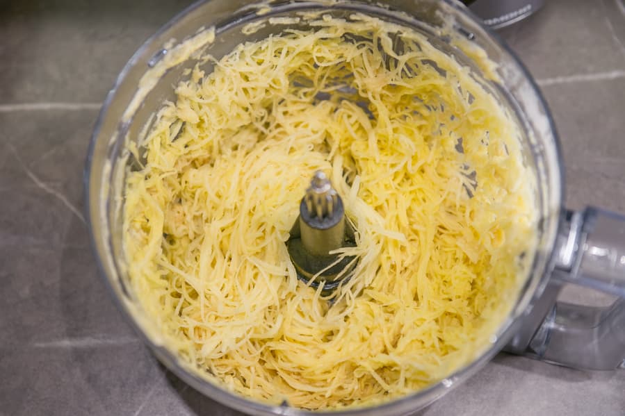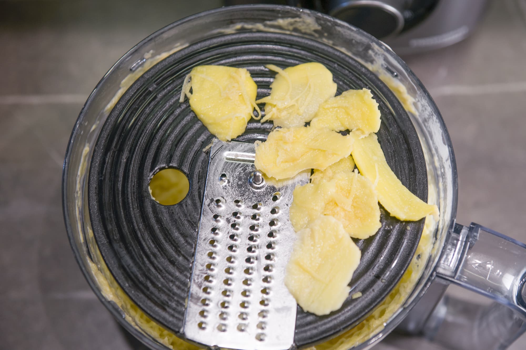 Для драников мы решили смешать тертый картофель разного размера, поэтому первые полкило натерли на крупной терке, а вторые — на самой мелкой. Овощи у нас были средней величины, так что дополнительно разрезать их не пришлось — они легко проскакивали в горловину и быстро натирались дисками.