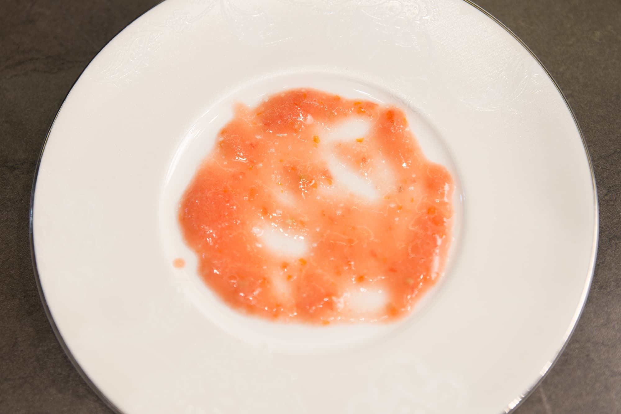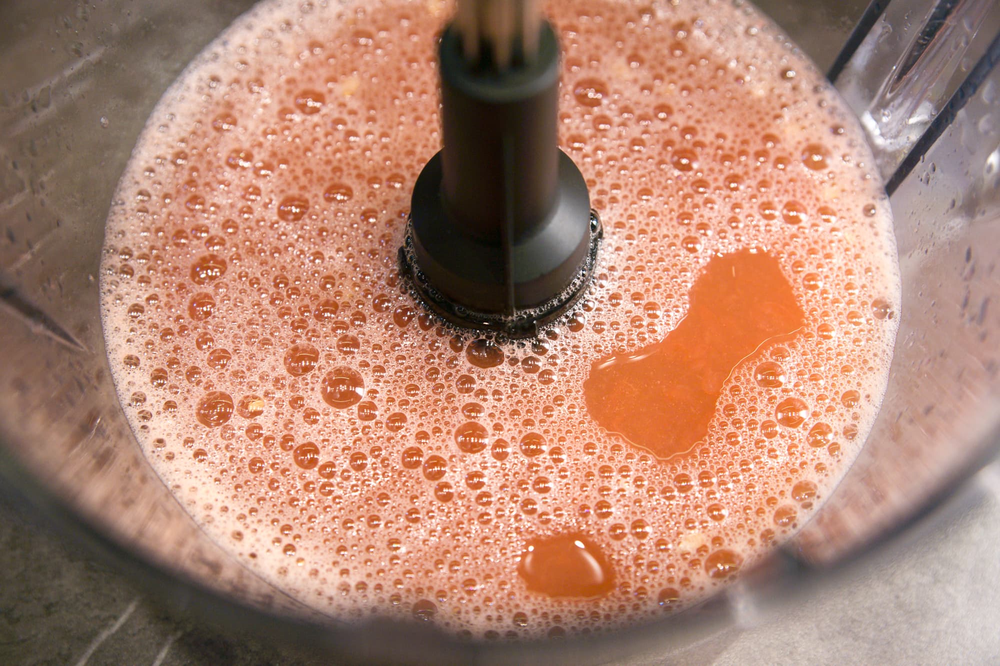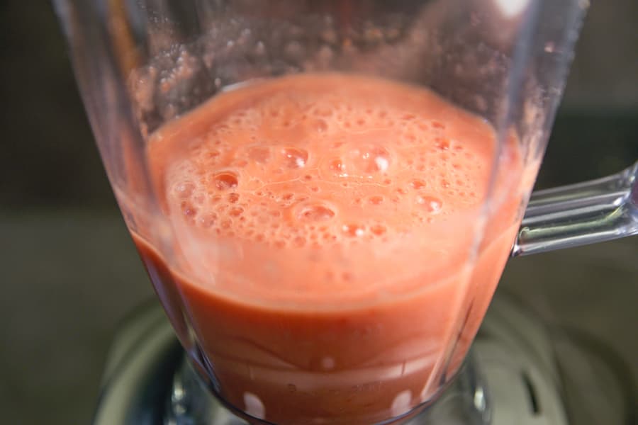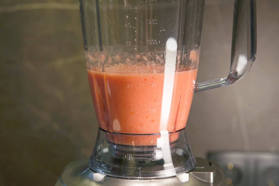 Измельчение происходило в основном режиме на максимальной скорости. Уже через 20 секунд мы получили помидорную массу без целых долек, но со всё еще виднеющимися семечками и фрагментами кожуры. Мы продолжили измельчение и через 30 секунд остановили блендер.