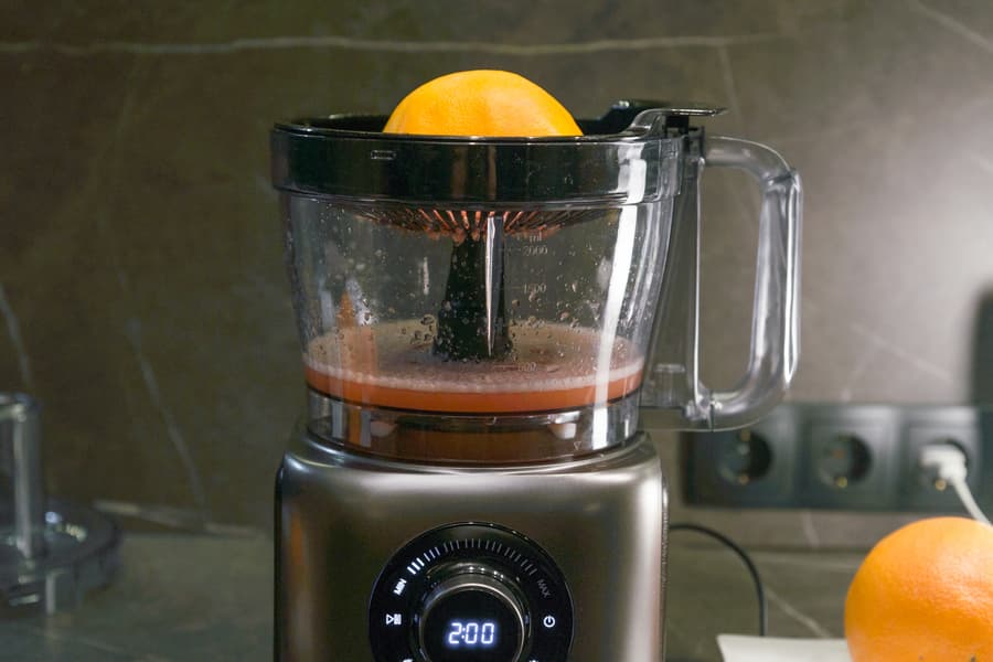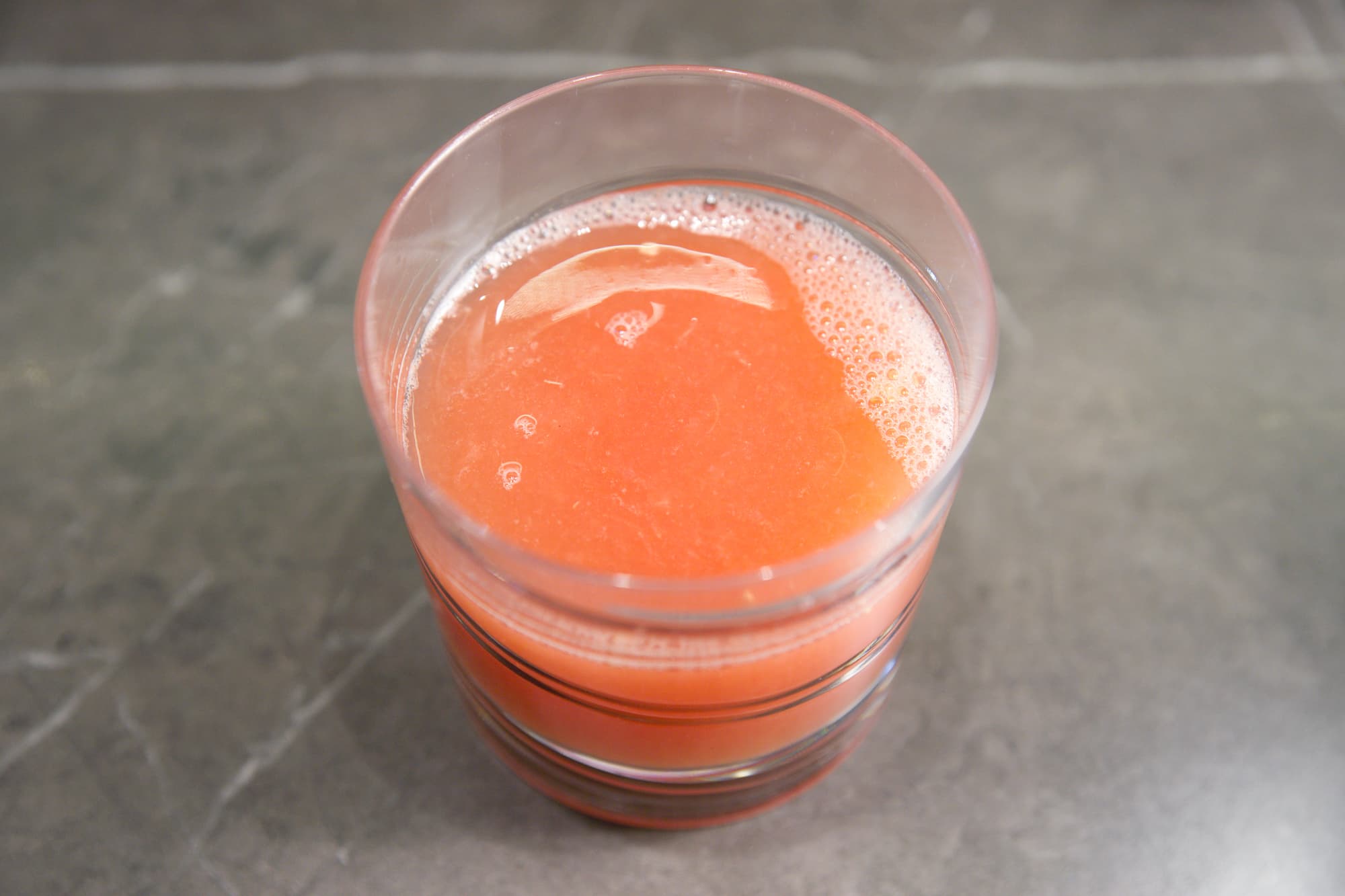 Крупный грейпфрут весом почти 600 г разрезали пополам, установили необходимую насадку на чашу, включили минимальную скорость и надели на отжимную головку половину фрукта. Мы надавливали на грейпфрут, насадка довольно быстро вращалась и выдавливала сок из мякоти. Фрукт был крупным, поэтому под конец половинку приходилось прижимать к насадке с силой. Соковыжималка самостоятельно отключилась ровно через 2 минуты, как и заявлено в инструкции, а мы не стали добавлять время, так как обнаружили, что сок выжат полностью. По инструкции, до следующего запуска прибору требуется перерыв на 10 минут, но если включить его сразу после отключения, он работает.