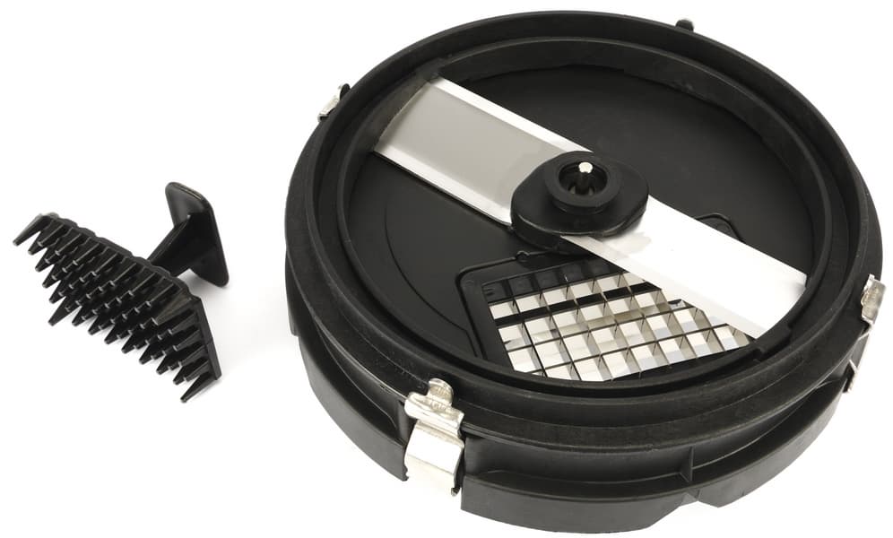 Насадка для нарезки кубиками представляет собой более сложную конструкцию, состоящую из режущей решетки и ножа.